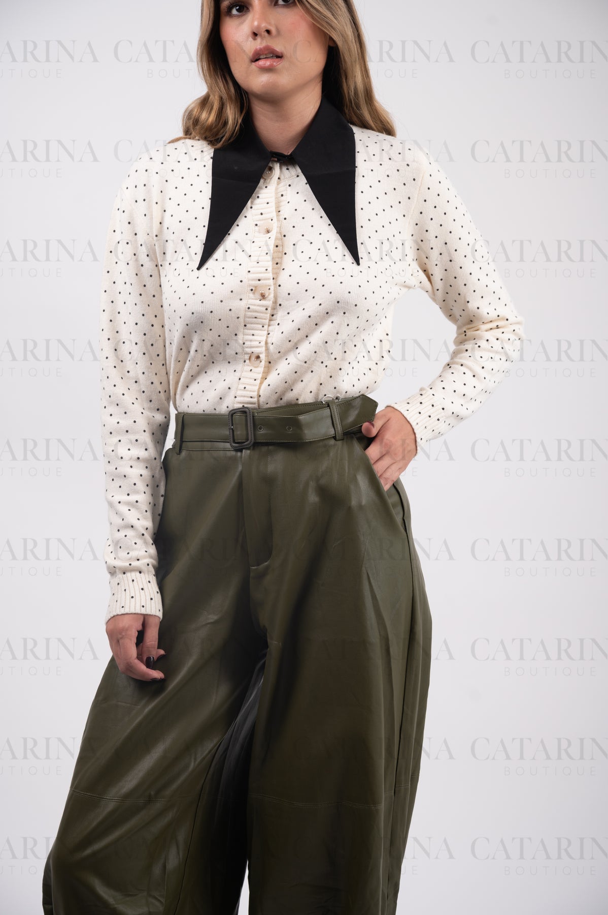 Suéter de cuello redondo. Manga larga. Botones delanteros. Color liso con estampado de boleado a contraste. Bajo acabado recto. COMPOSICIÓN:100% Poliéster.Material que no se estira ni se encoge.NO INCLUYE ACCESORIOS