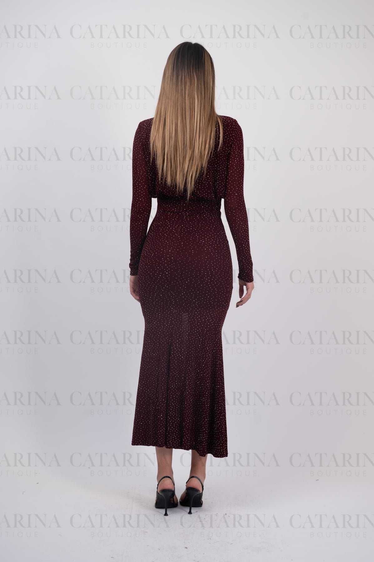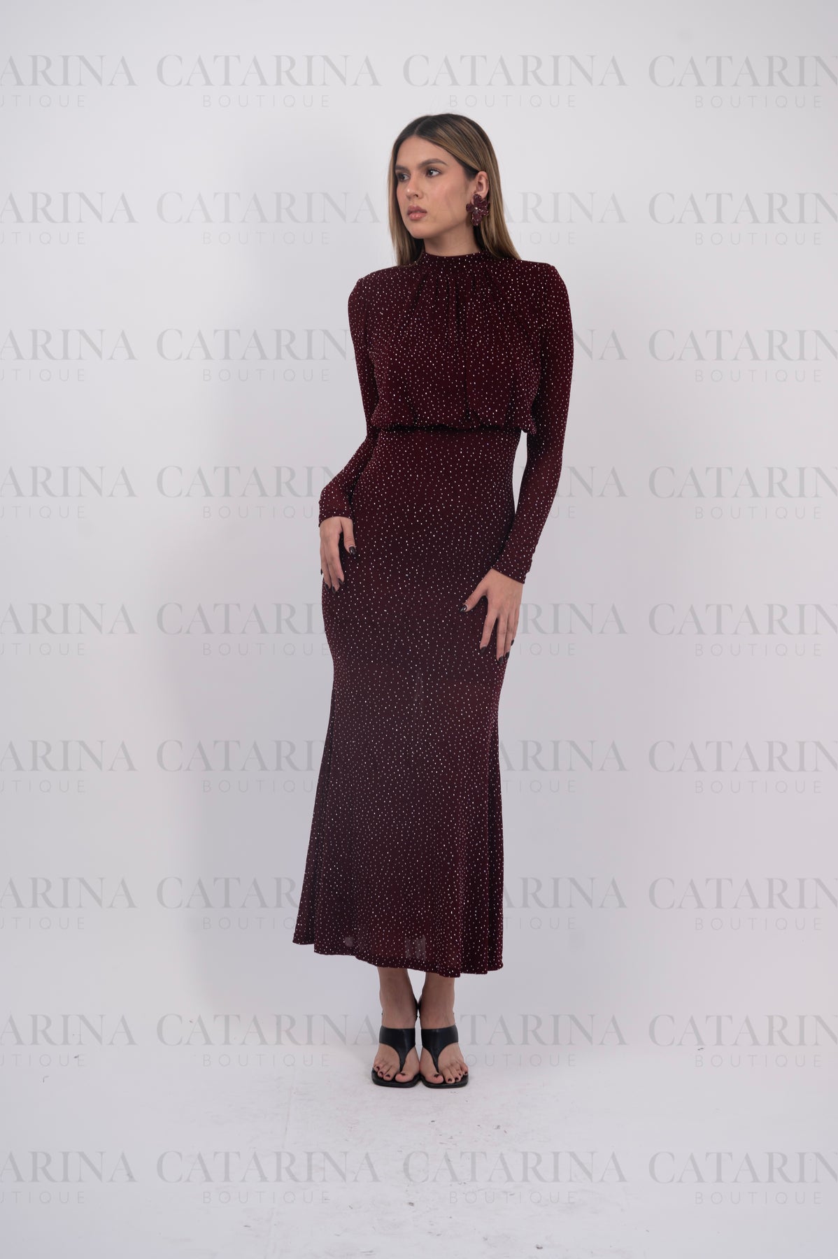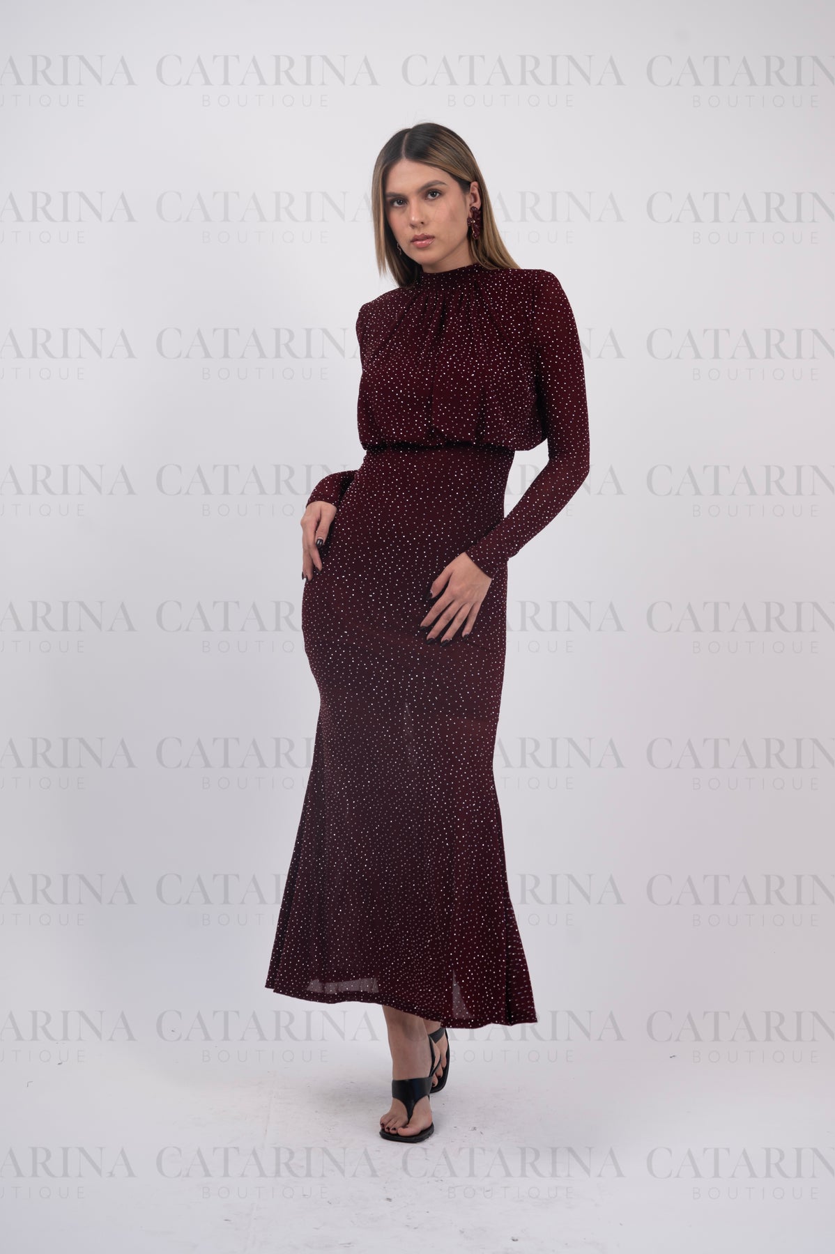 Vestido de color liso con detalle de brillos en plateado. Manga larga. Cuello alto y un torso de estilo drapeado que se frunce en la cintura para definir la figura. Bajo acabado recto.