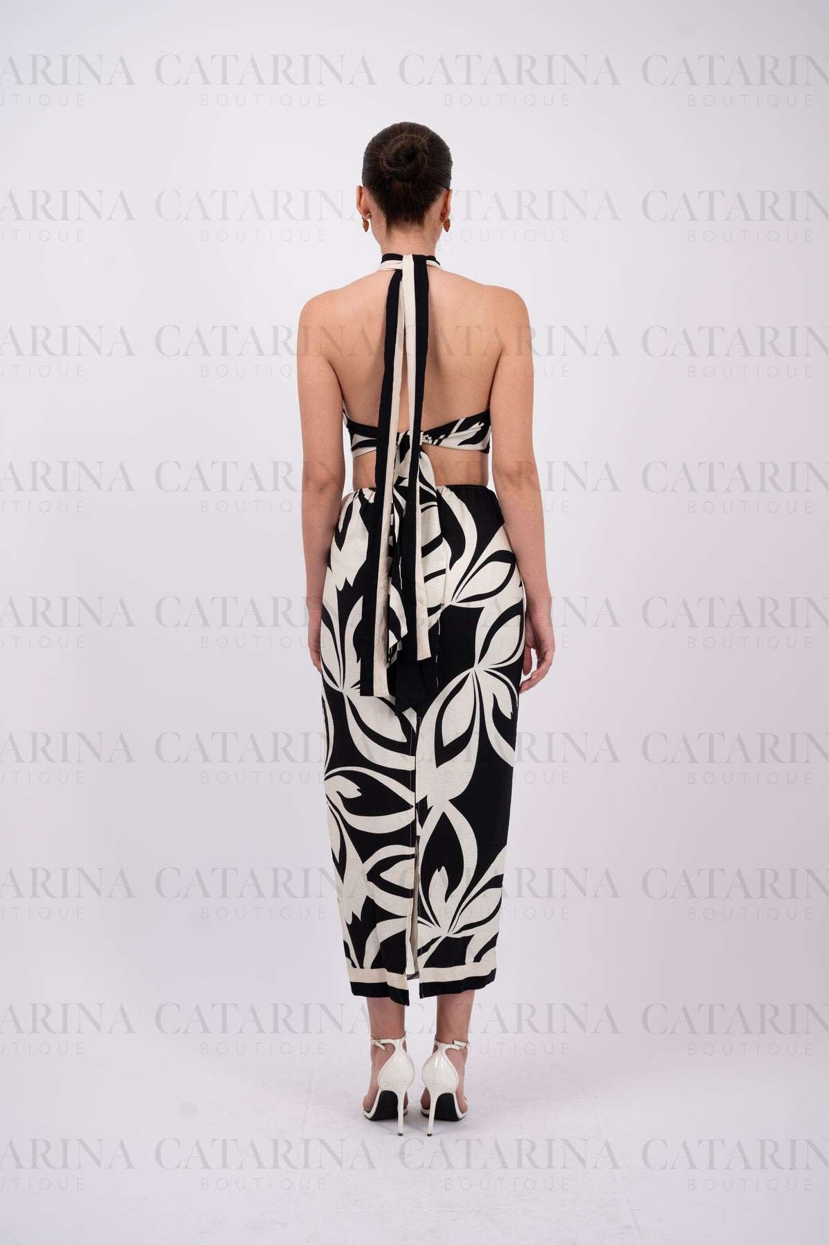 Vestido bicolor. Tipo halter. Detalle de estampado y aberturas en la cintura. Cierre oculto.