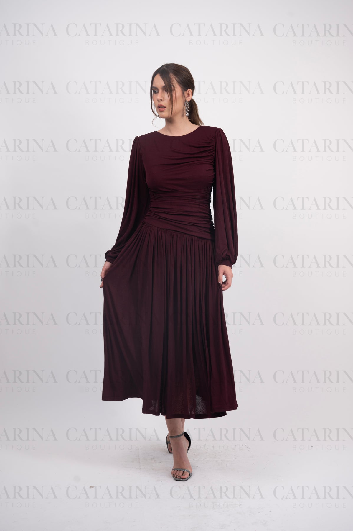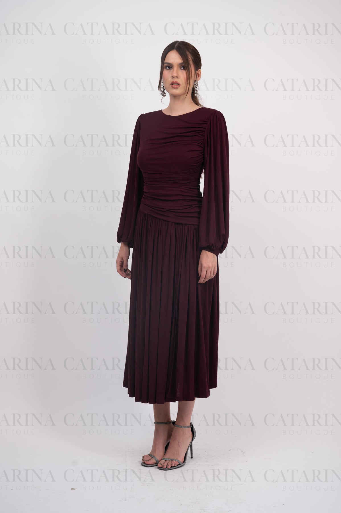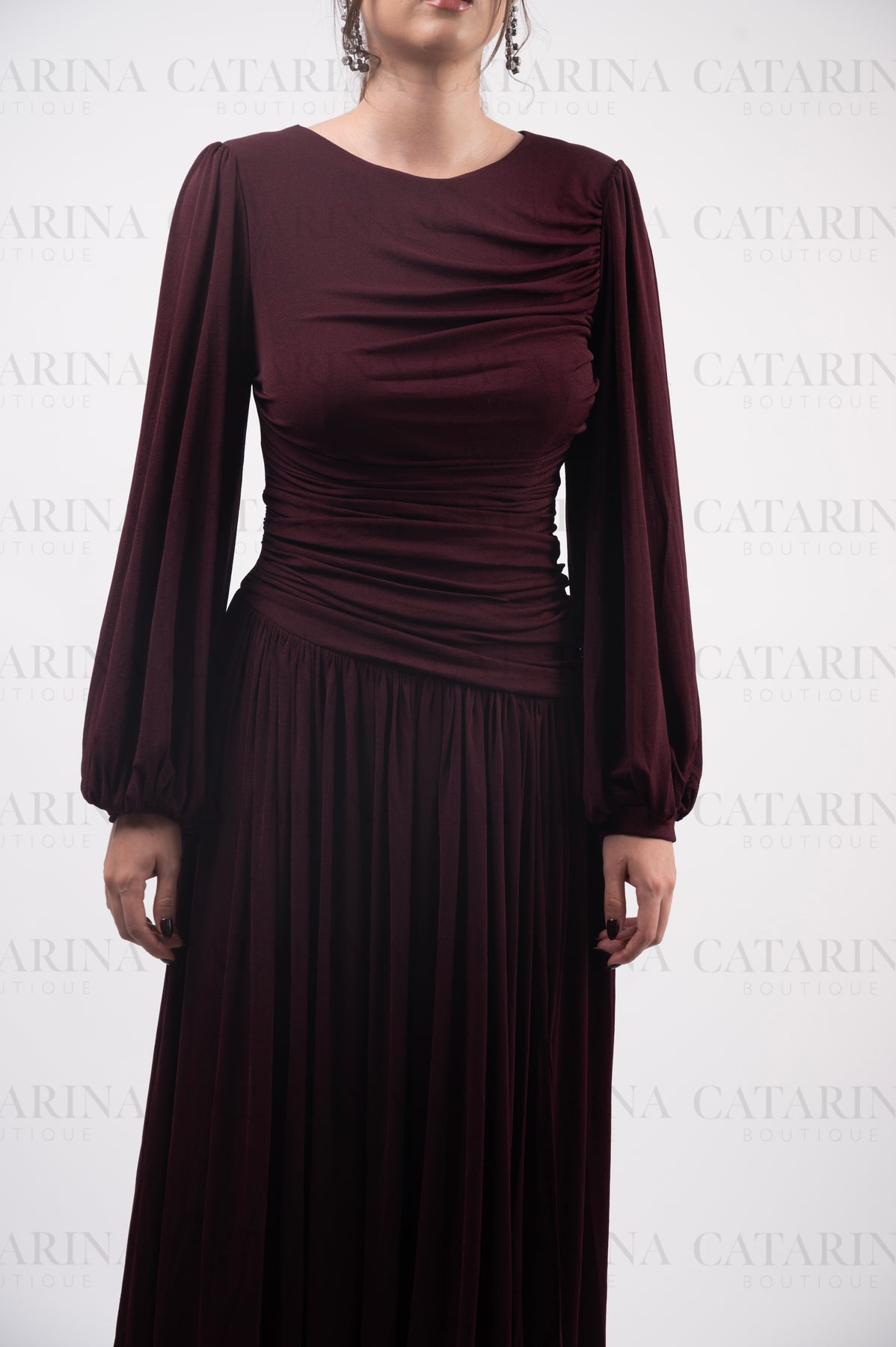 Vestido largo. Cuello redondo. Pliegues y fruncidos. Mangas largas. Bajo acabado recto.
