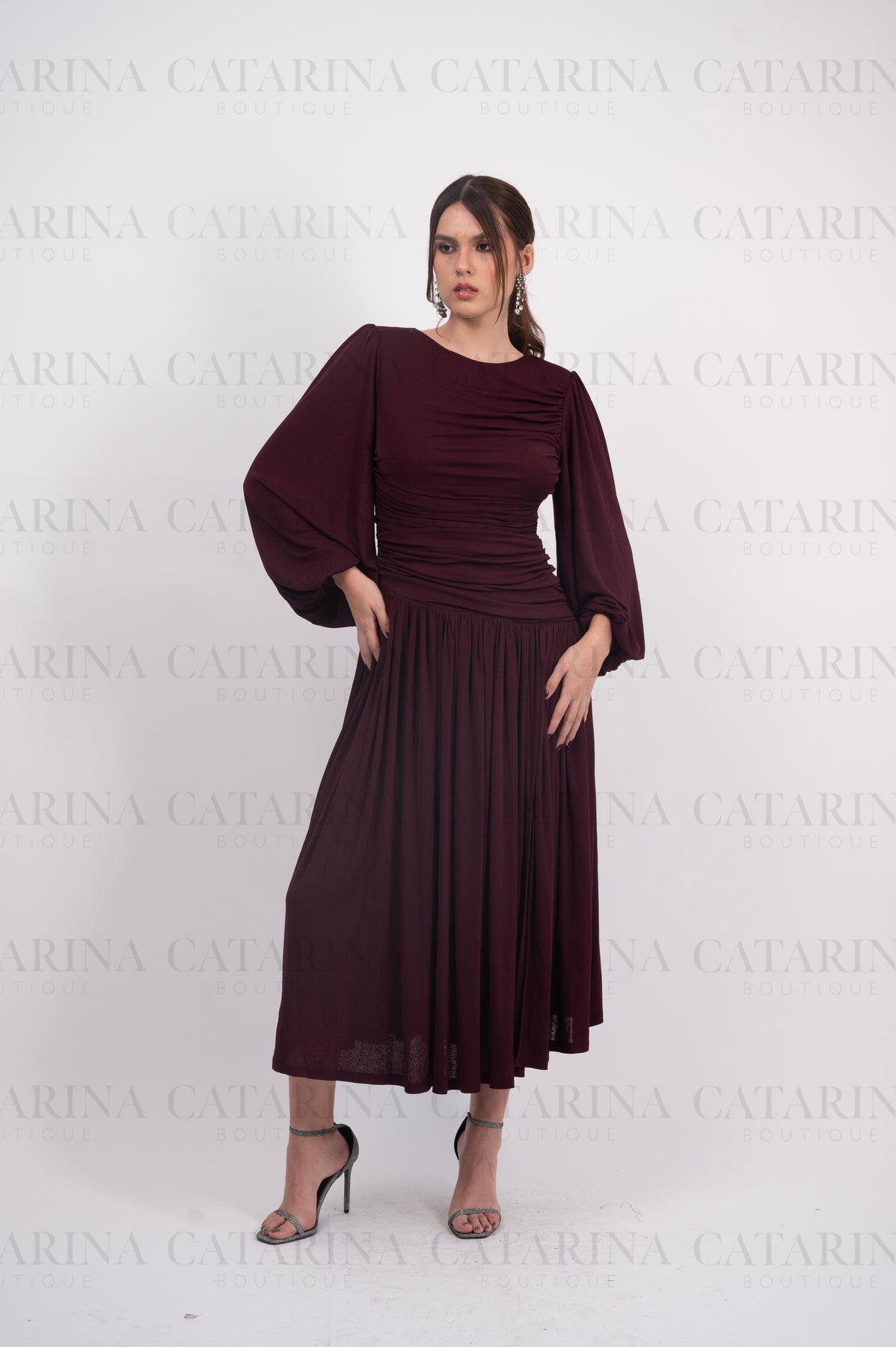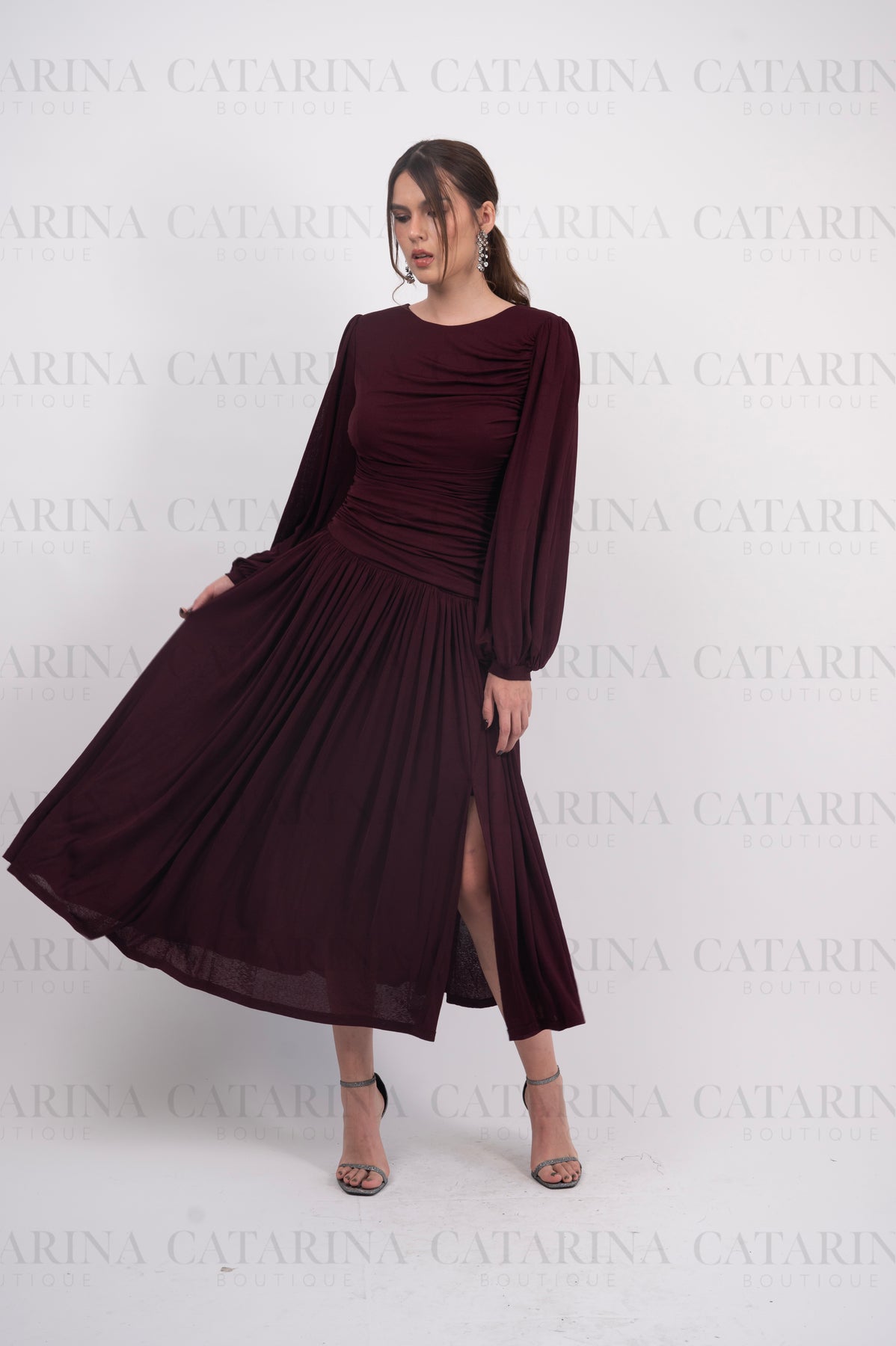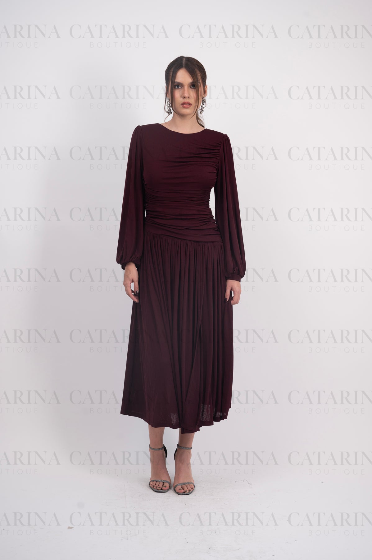 Vestido largo. Cuello redondo. Pliegues y fruncidos. Mangas largas. Bajo acabado recto.