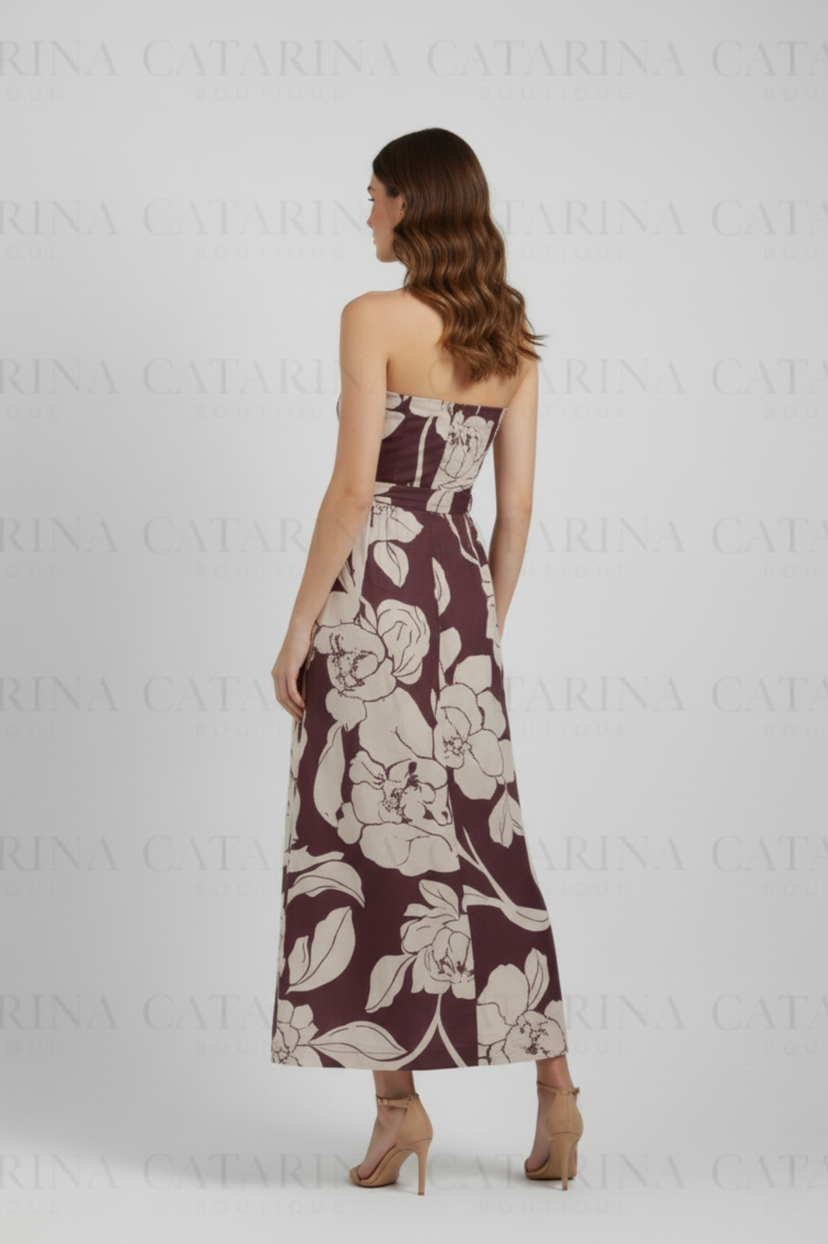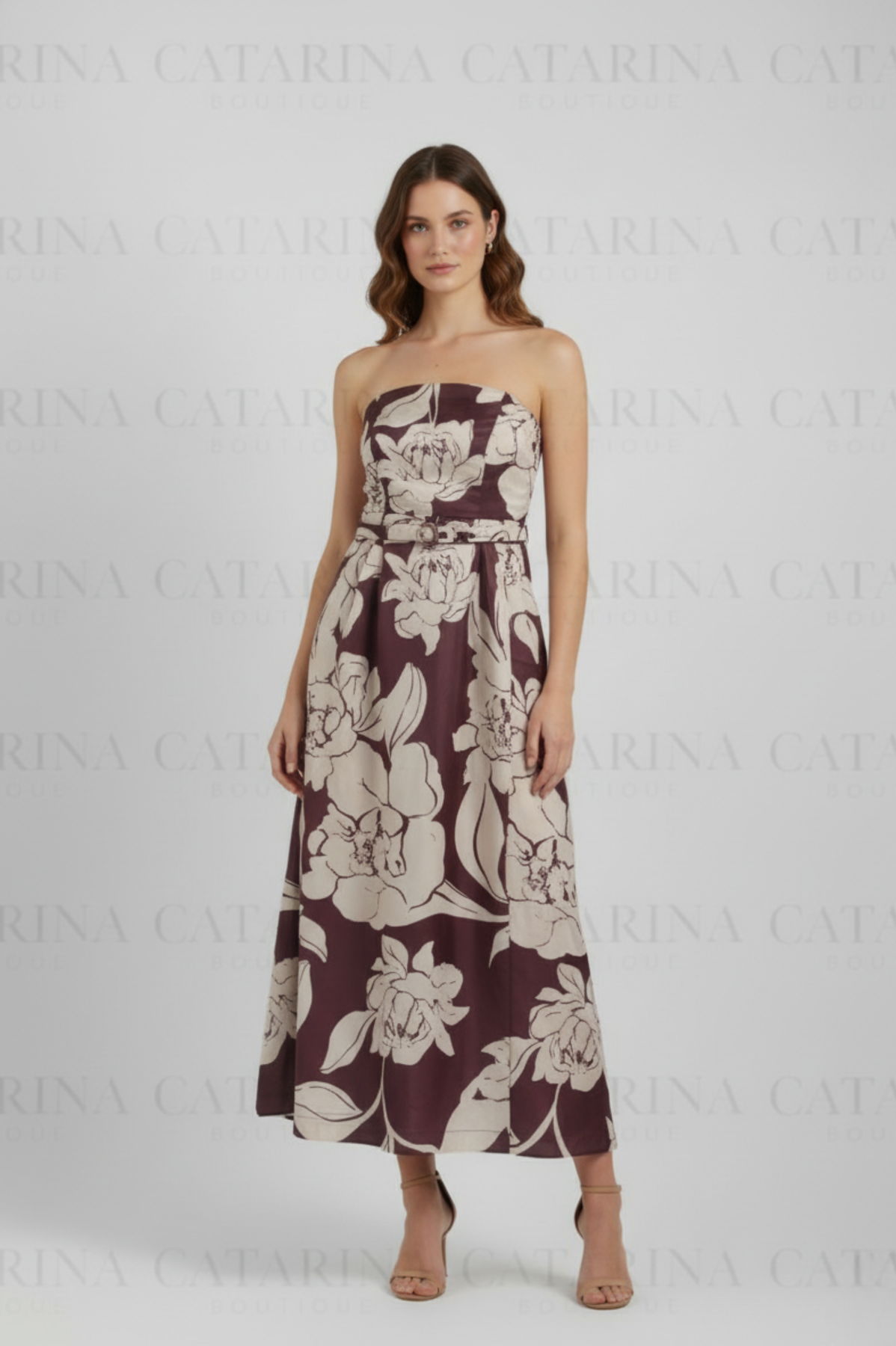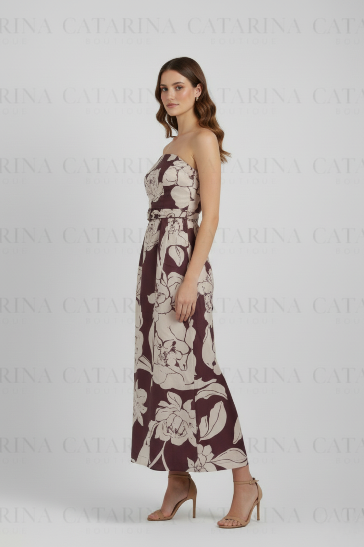 Vestido strapless. Estampado flora. La silueta tiene una cintura marcada por un cinturón de la misma tela. Bajo con volumen y pliegues.