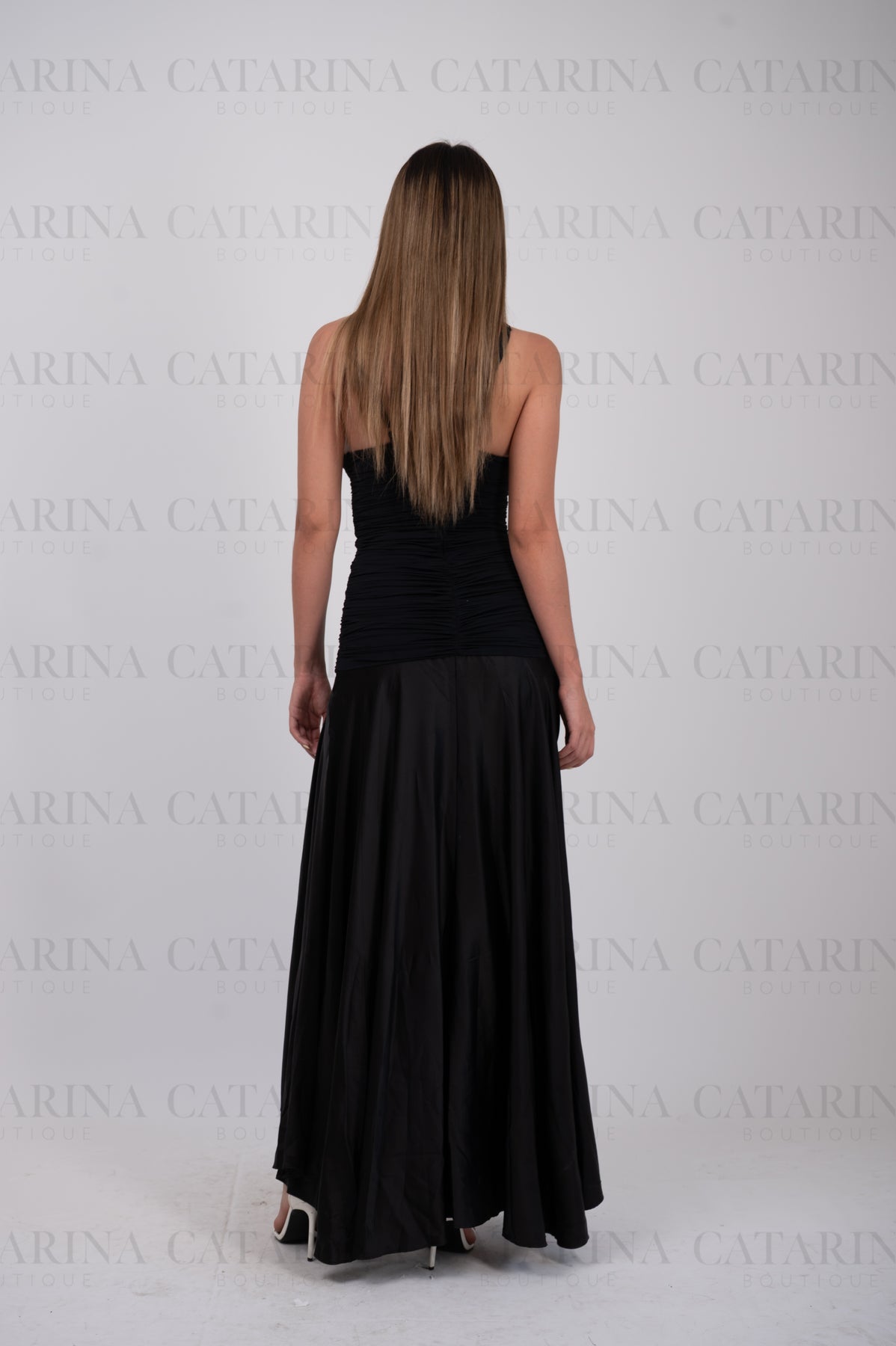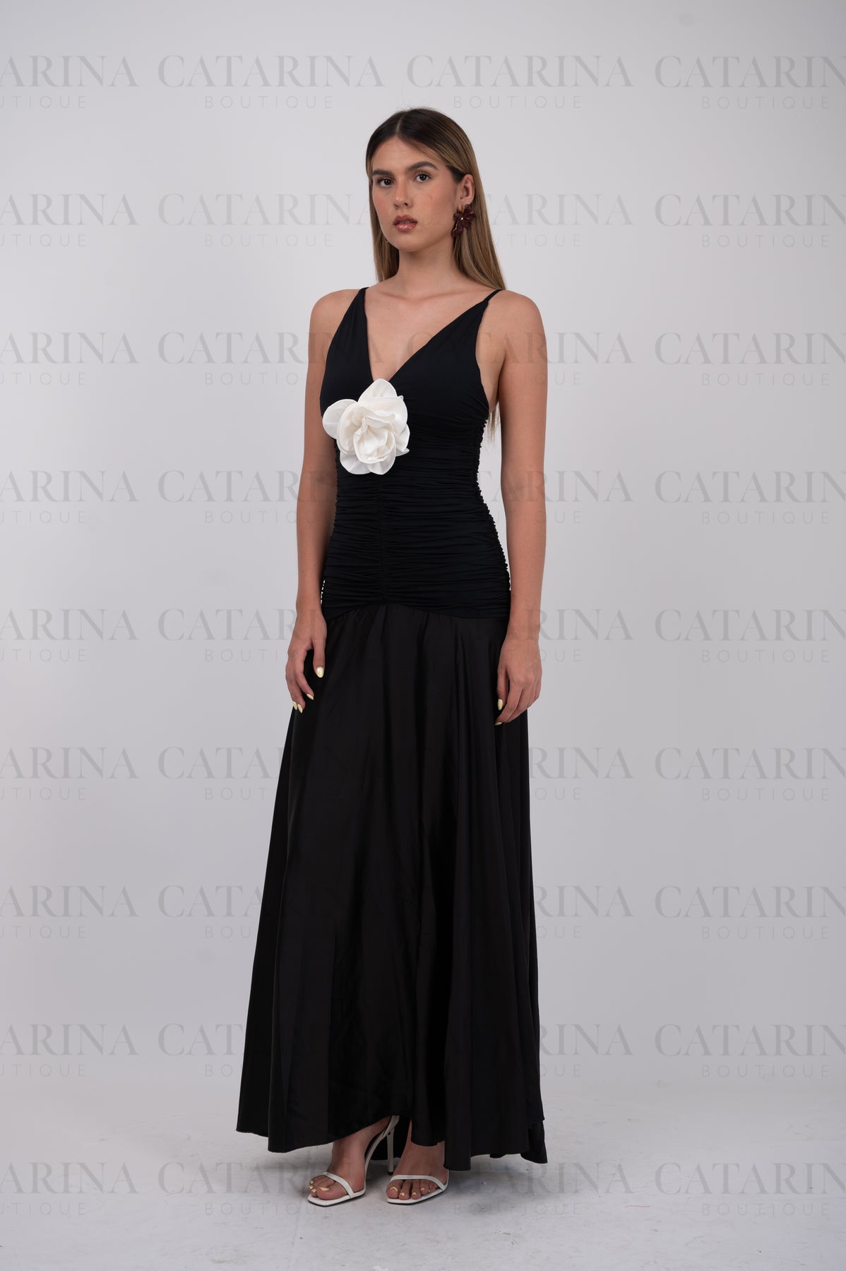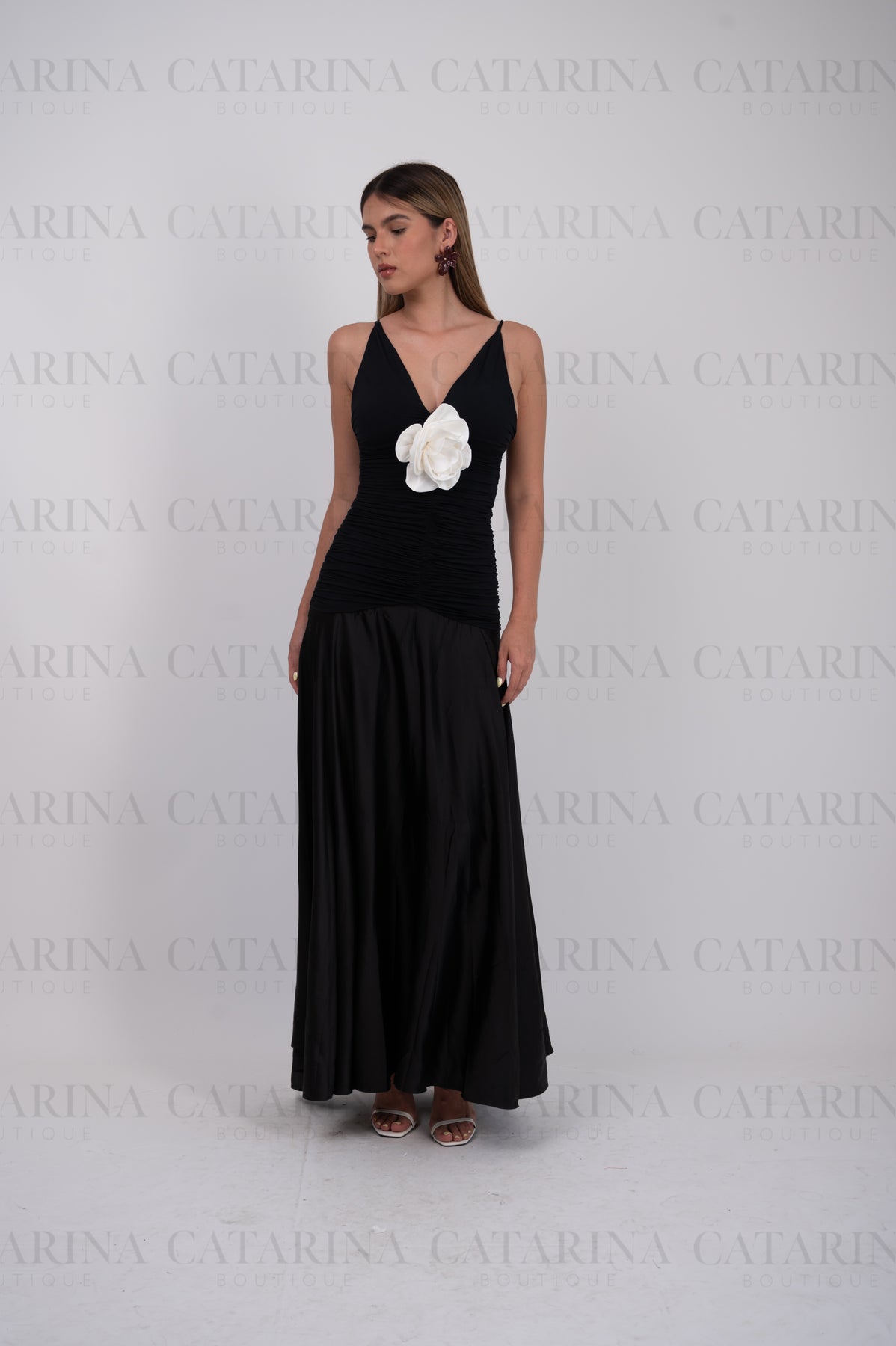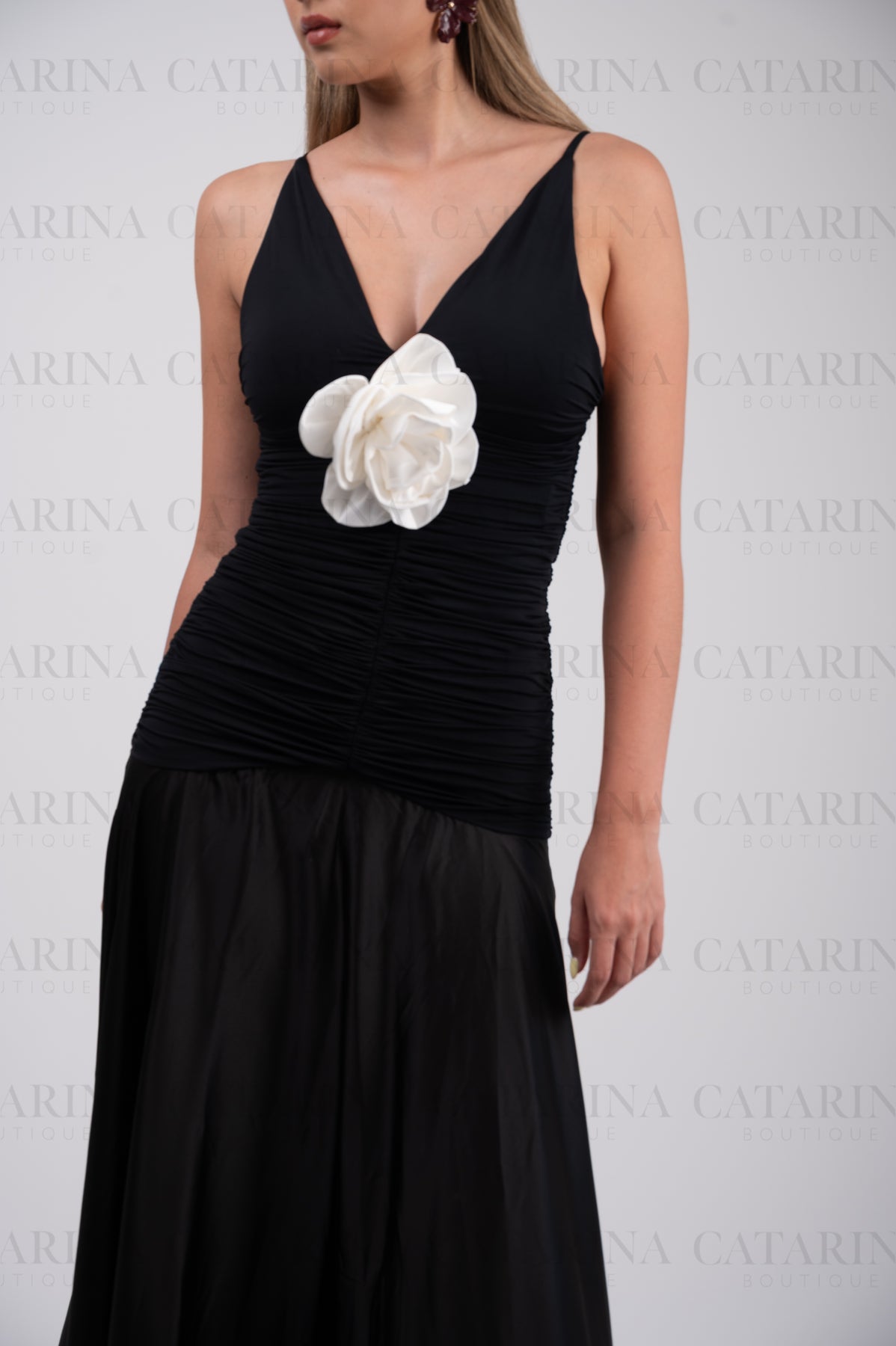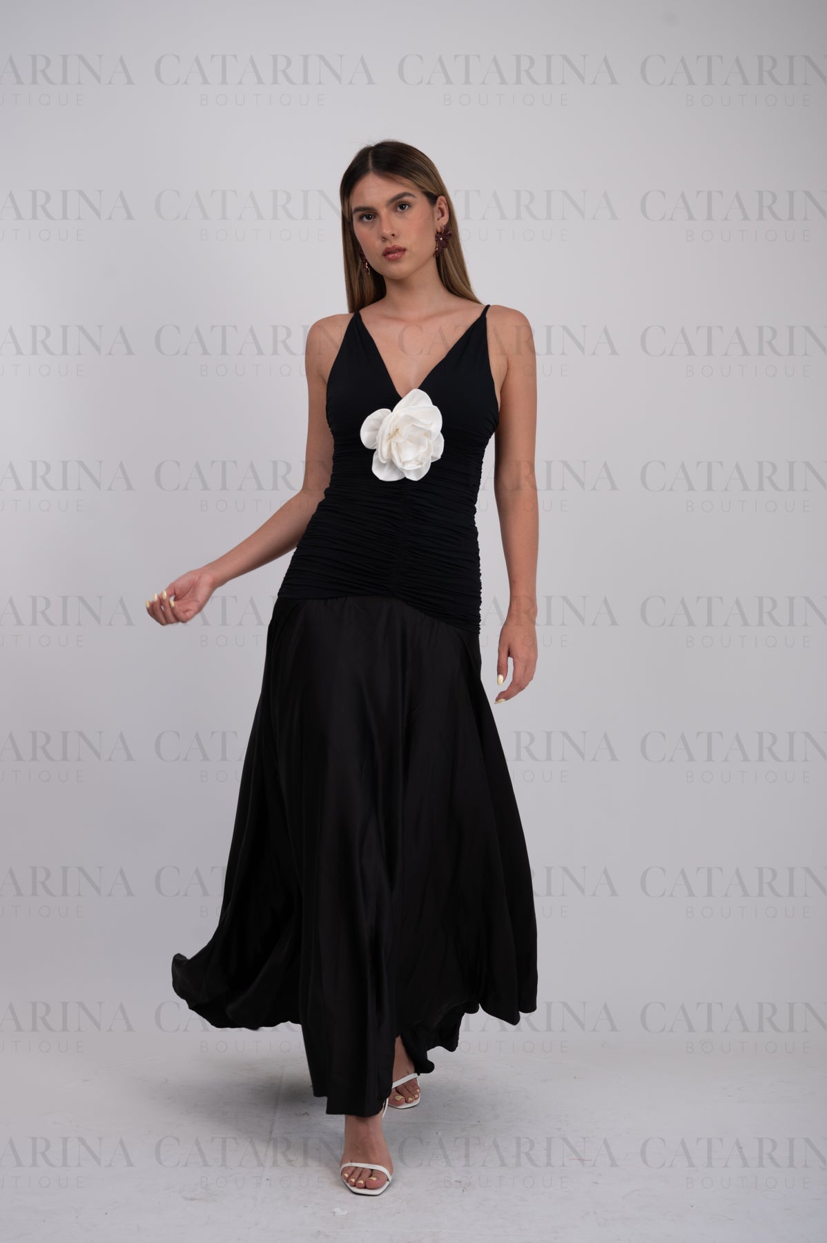 Vestido de color liso, tirantes delgados y escote pronunciado. Detalle de drapeado y volante en el bajo.