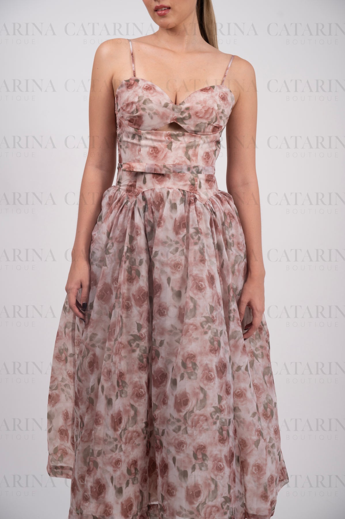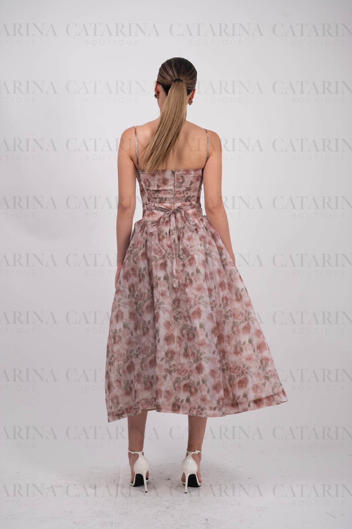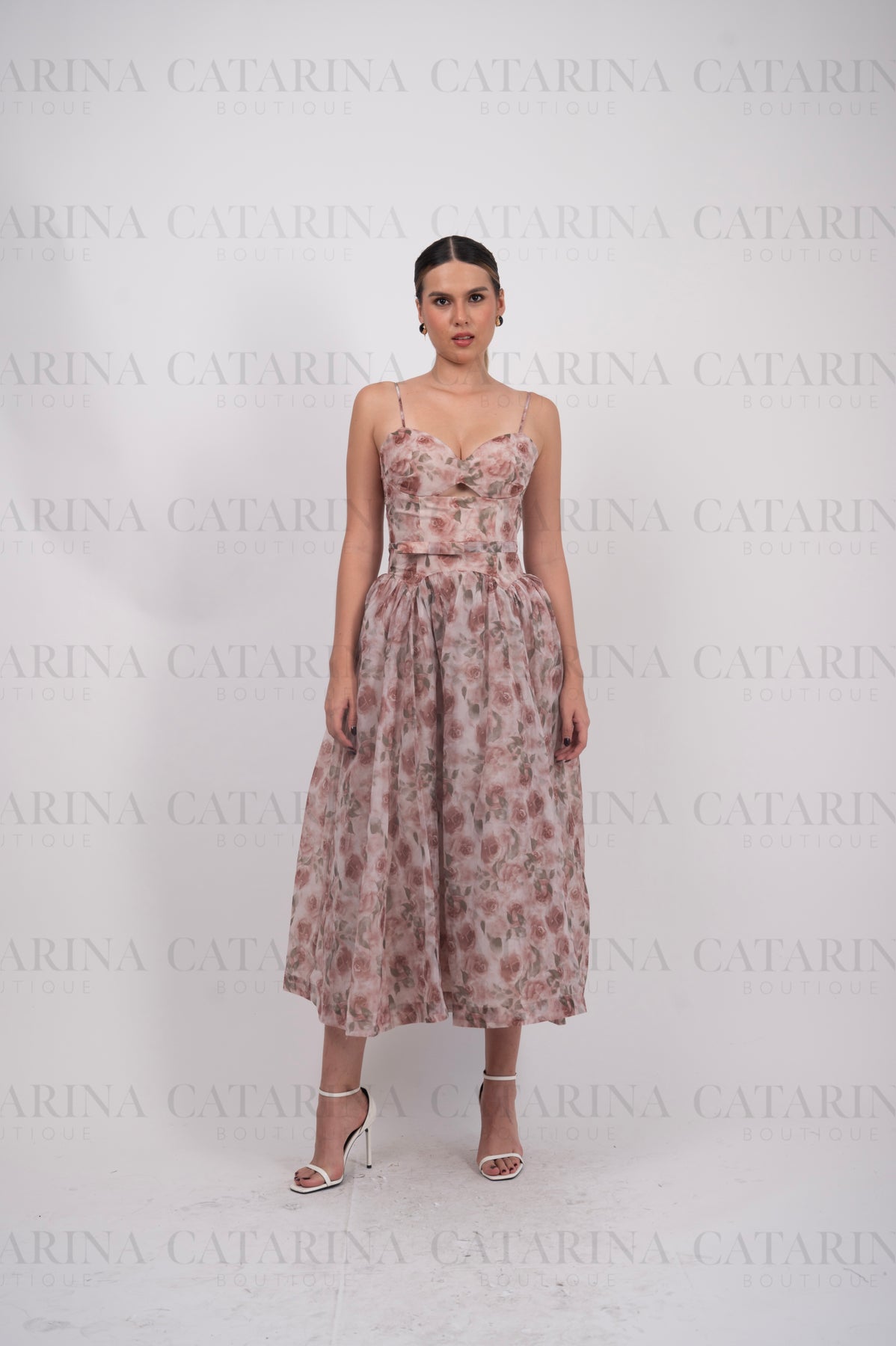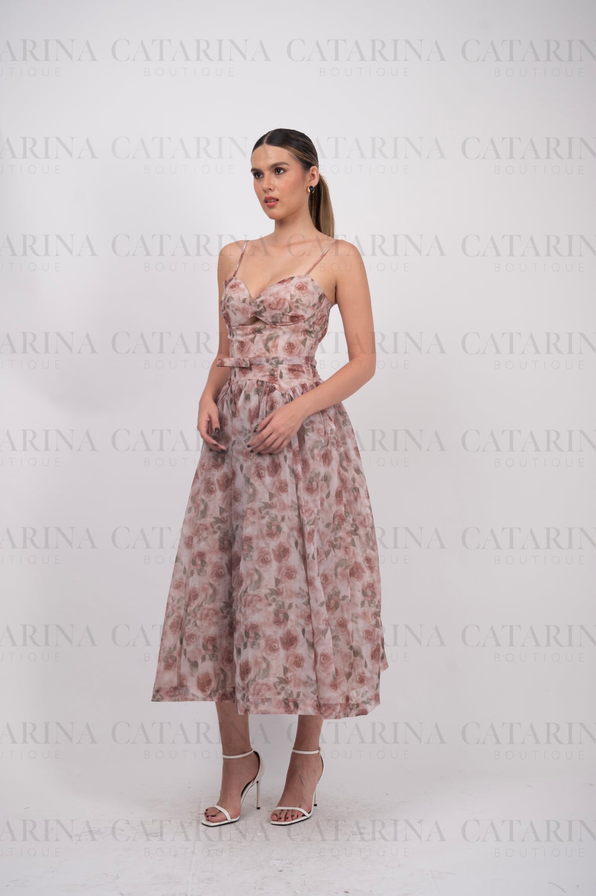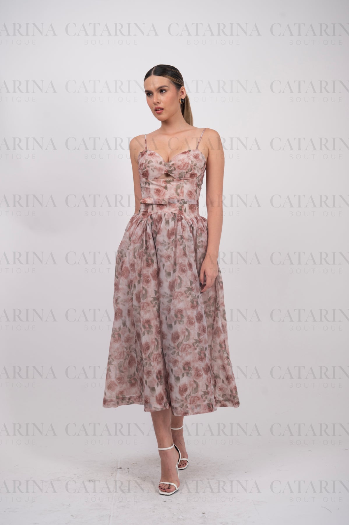 Vestido de estampado floral. Busto es estilo corsé, con copas estructuradas y tirantes finos. La cintura está marcada con un fruncido que crea volumen en la falda.