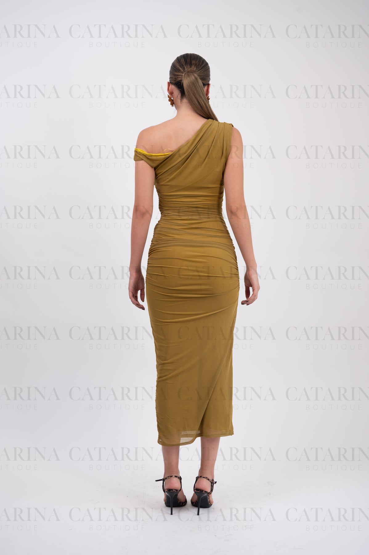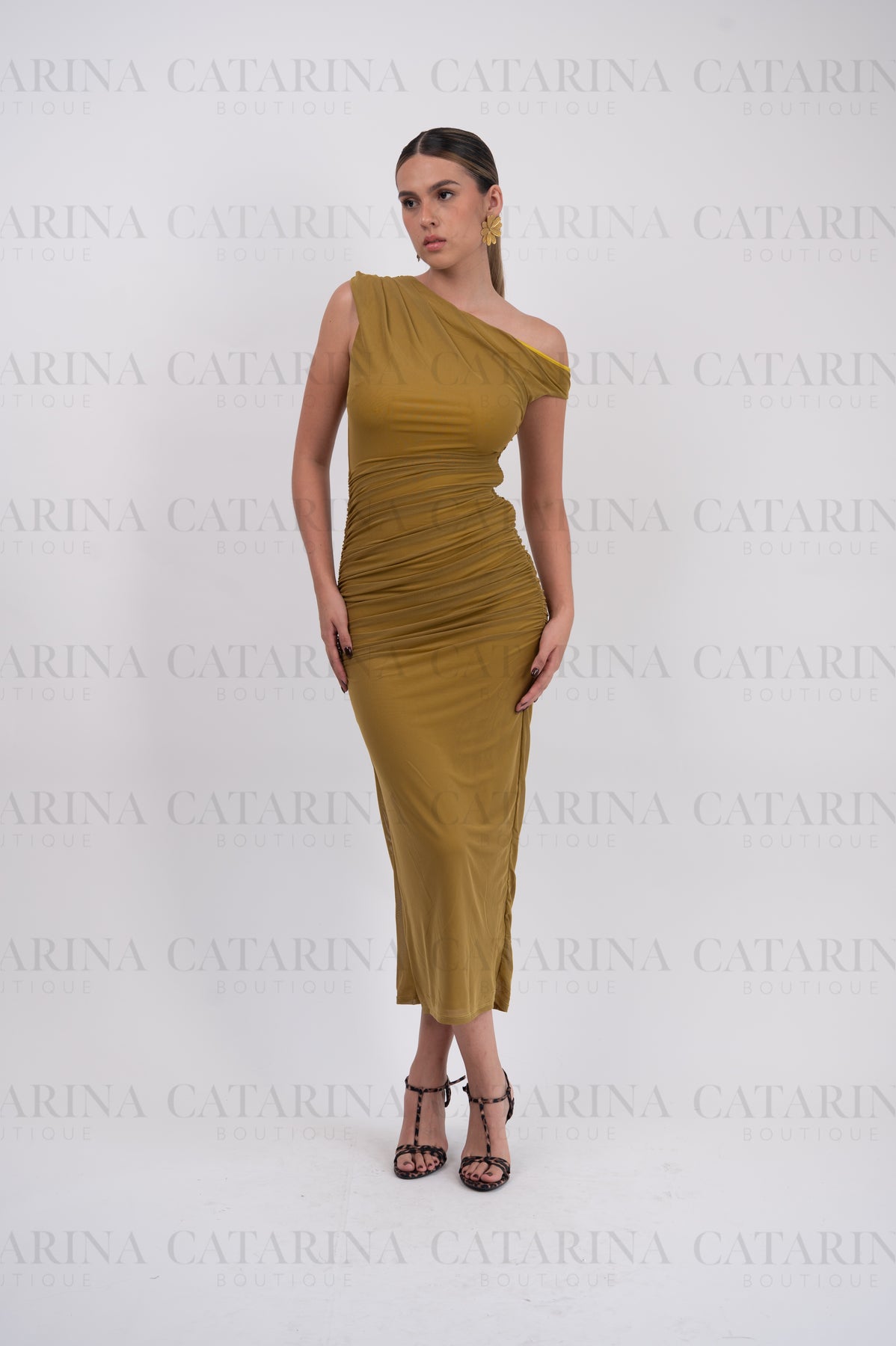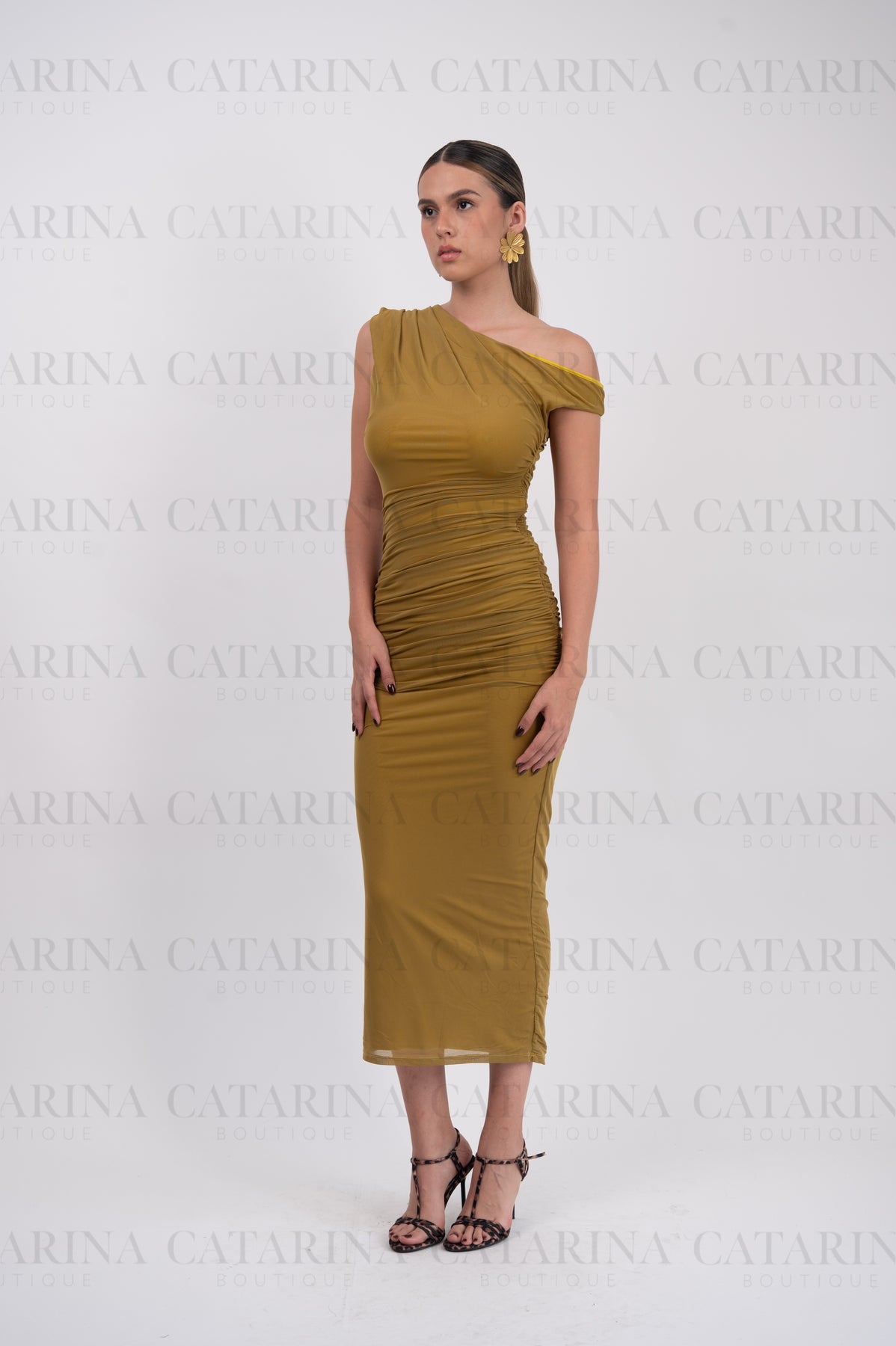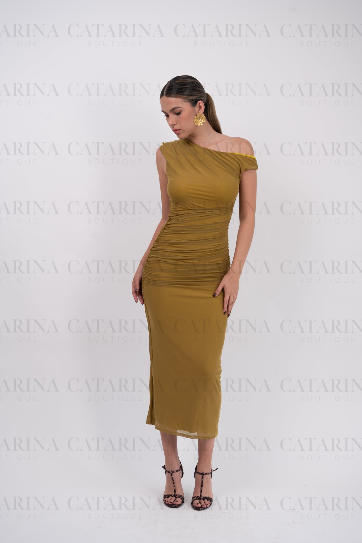 Vestido de color liso. Escote redondo. Tirantes gruesos. Detalle de drapeado. Bajo acabado recto.