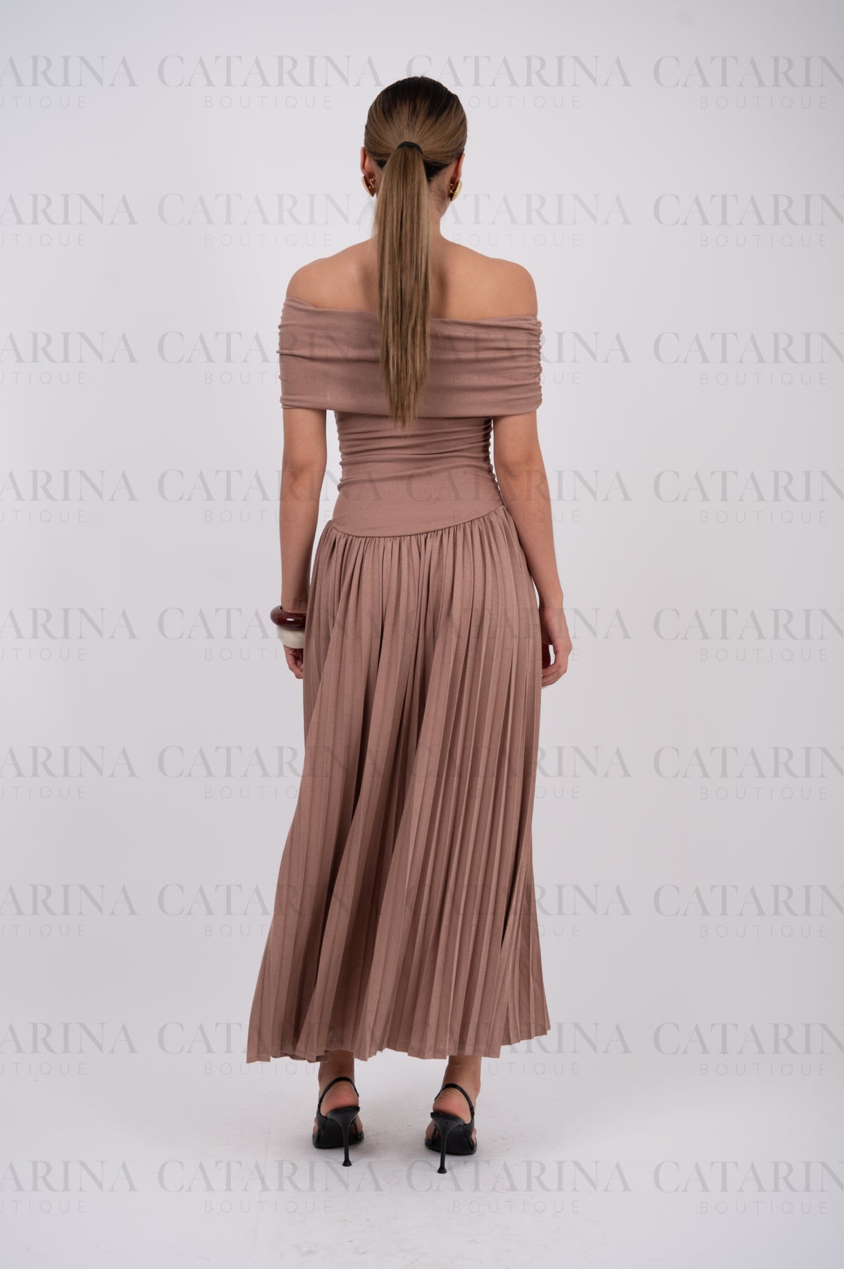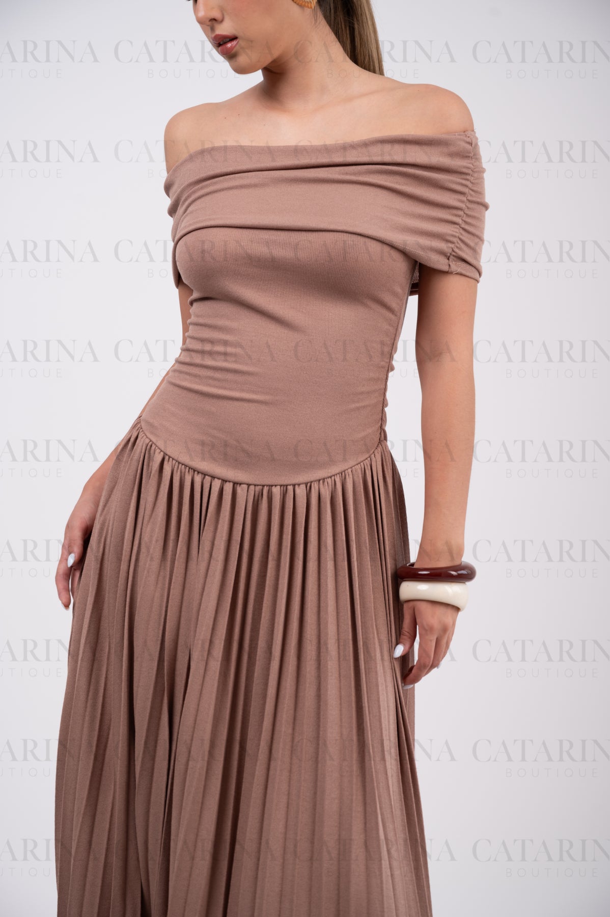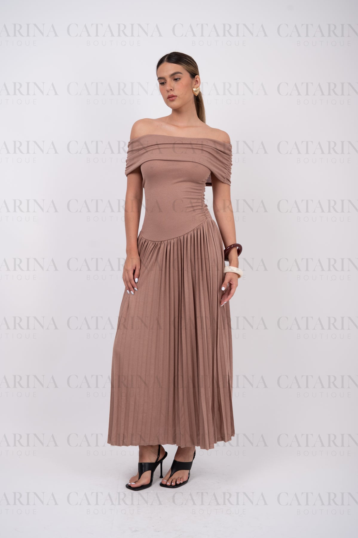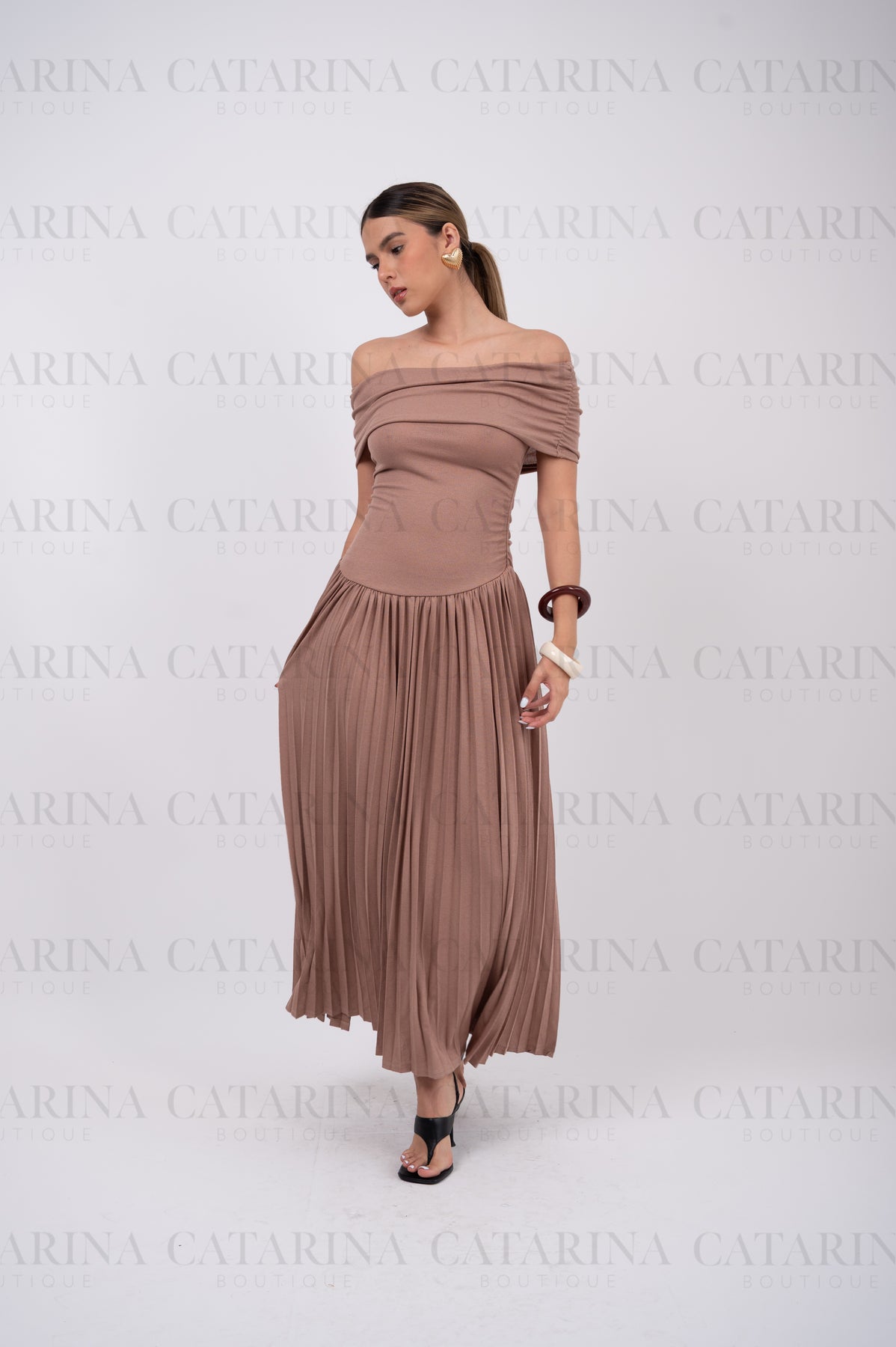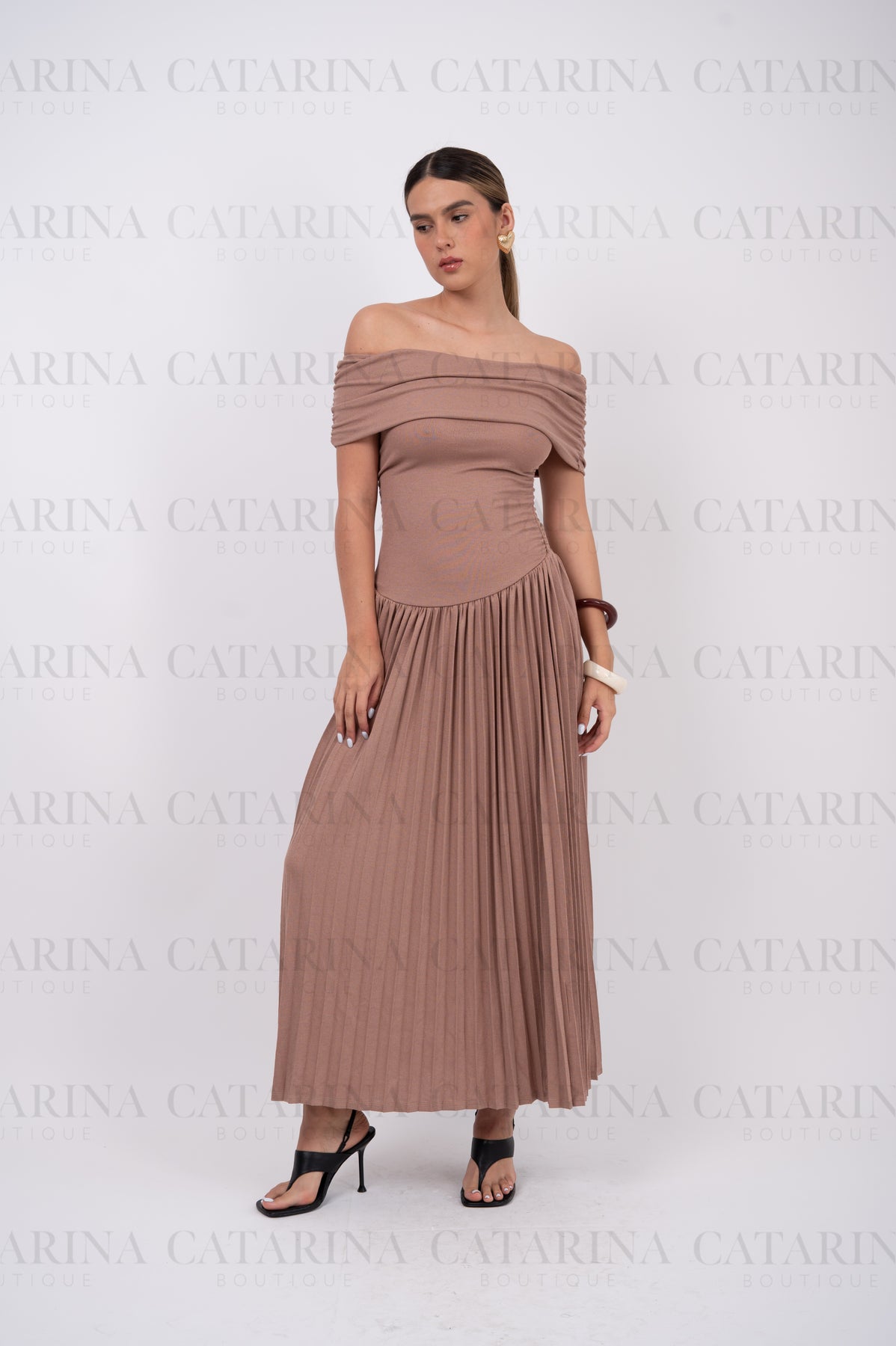 Vestido de color liso. Escote recto. Bajo acabado con plises.
