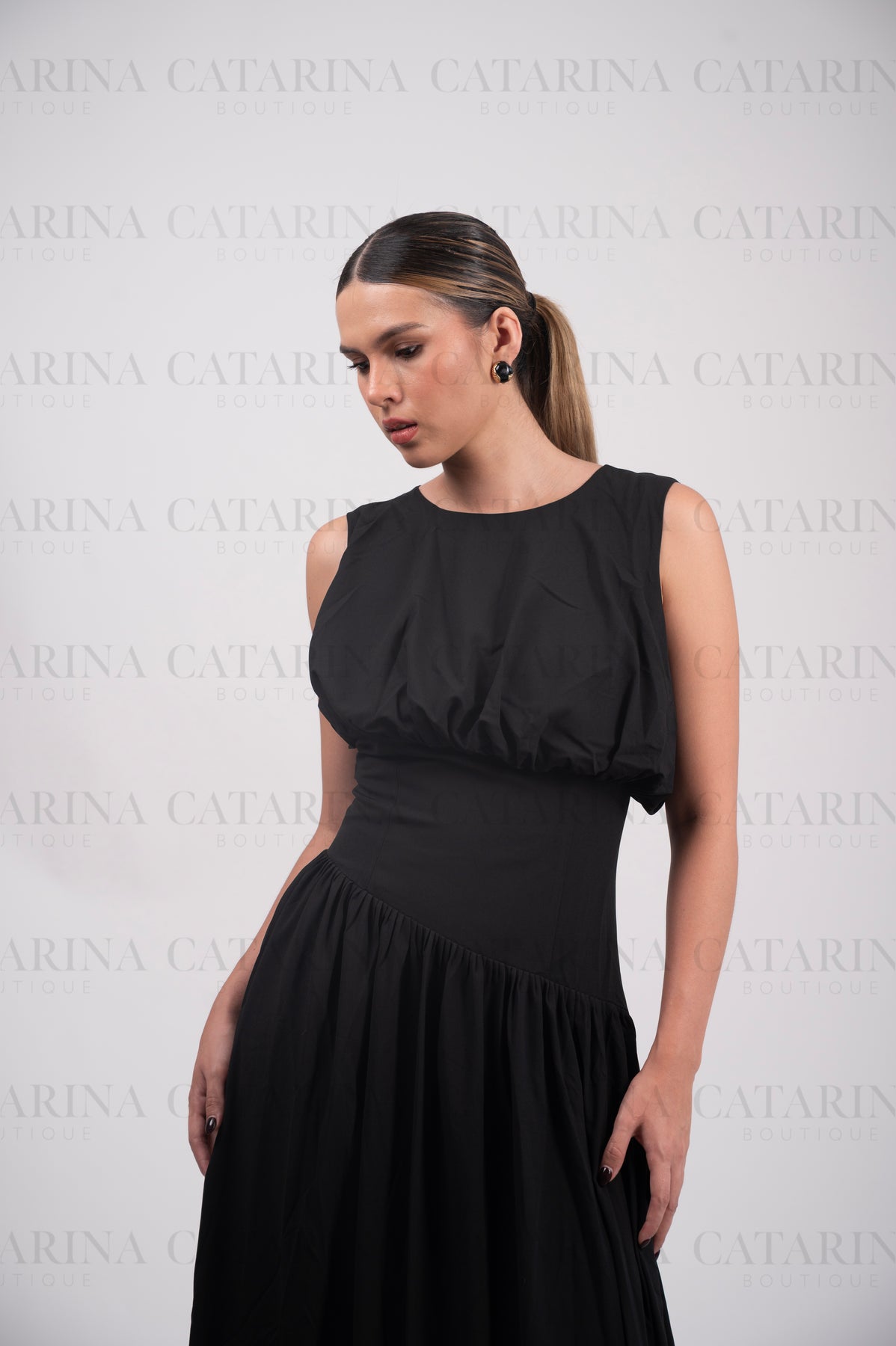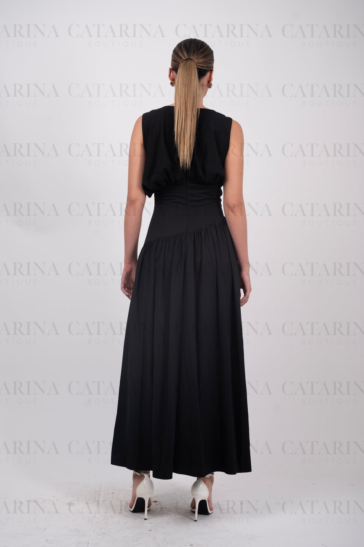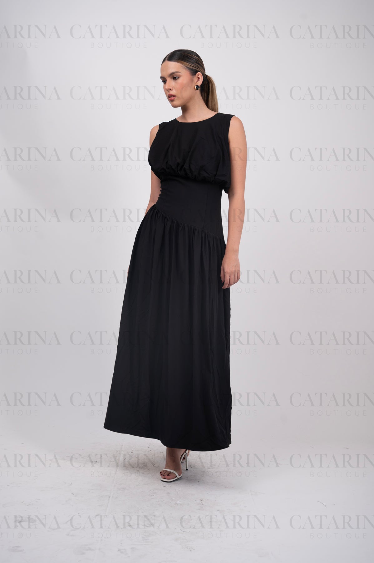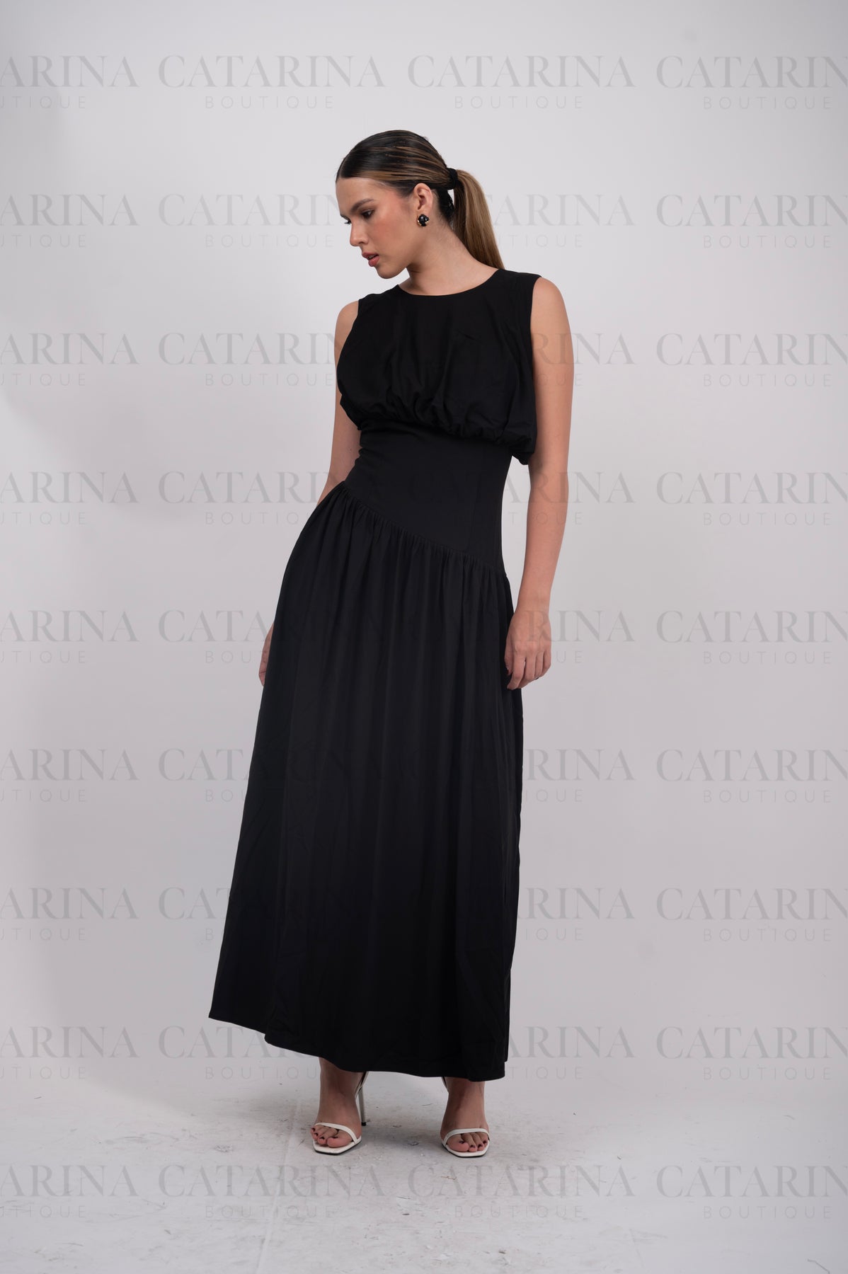Vestido de hombros anchos y sin mangas, con un escote redondo.  Bajo acabado recto y liso, cayendo desde la cintura entallada.