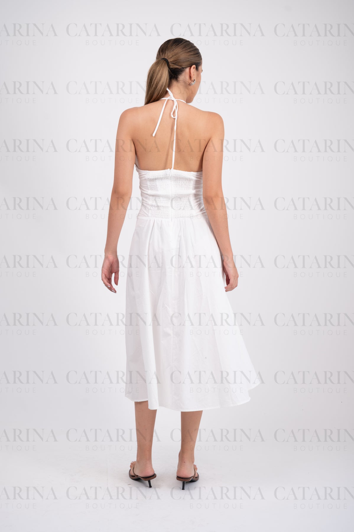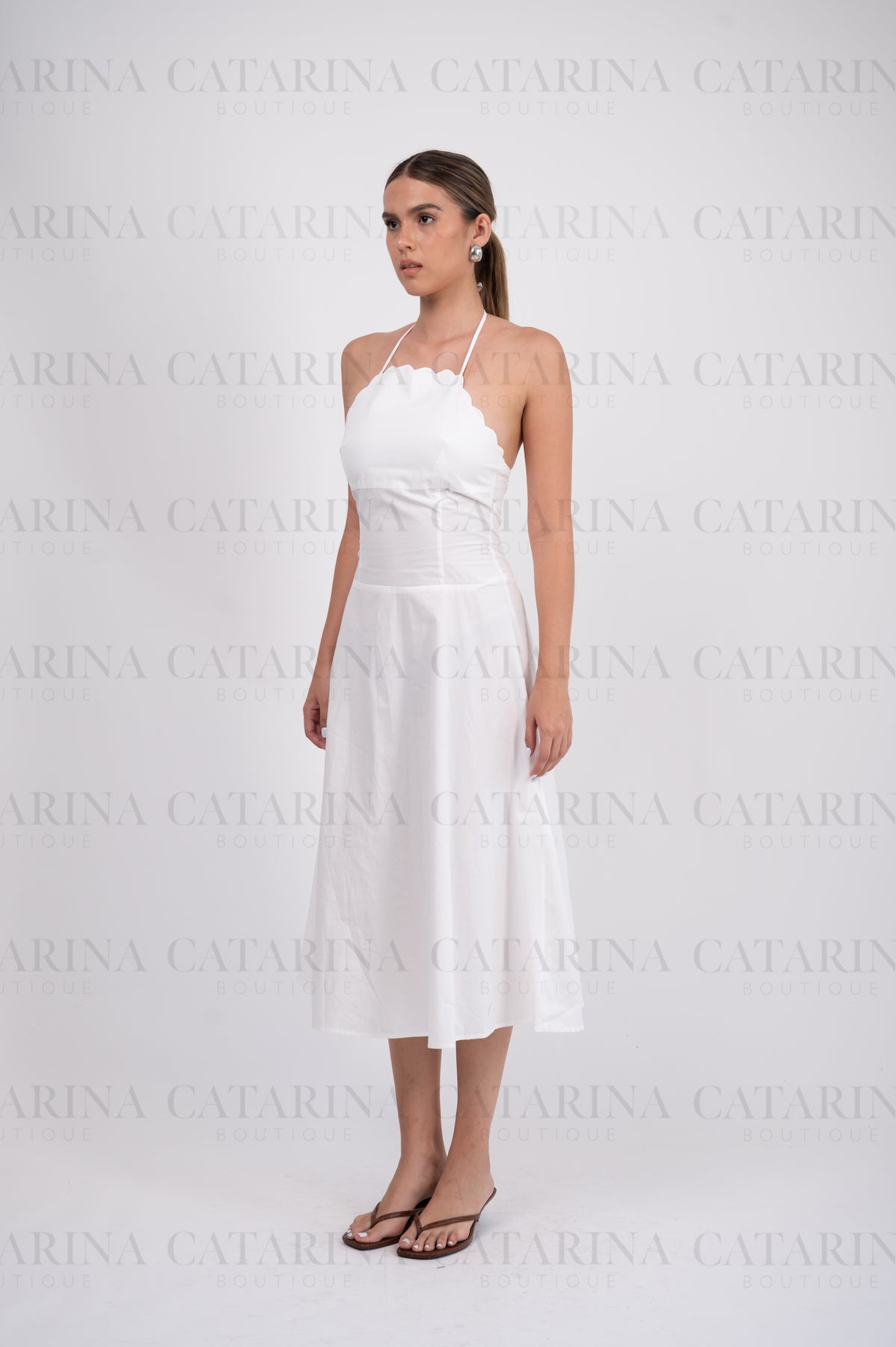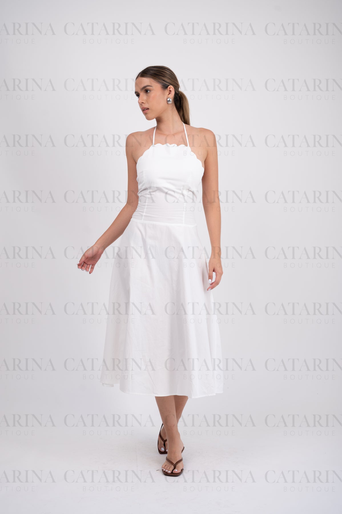 Vestido de color liso. Escote tipo halter. Bajo acabado con volante.