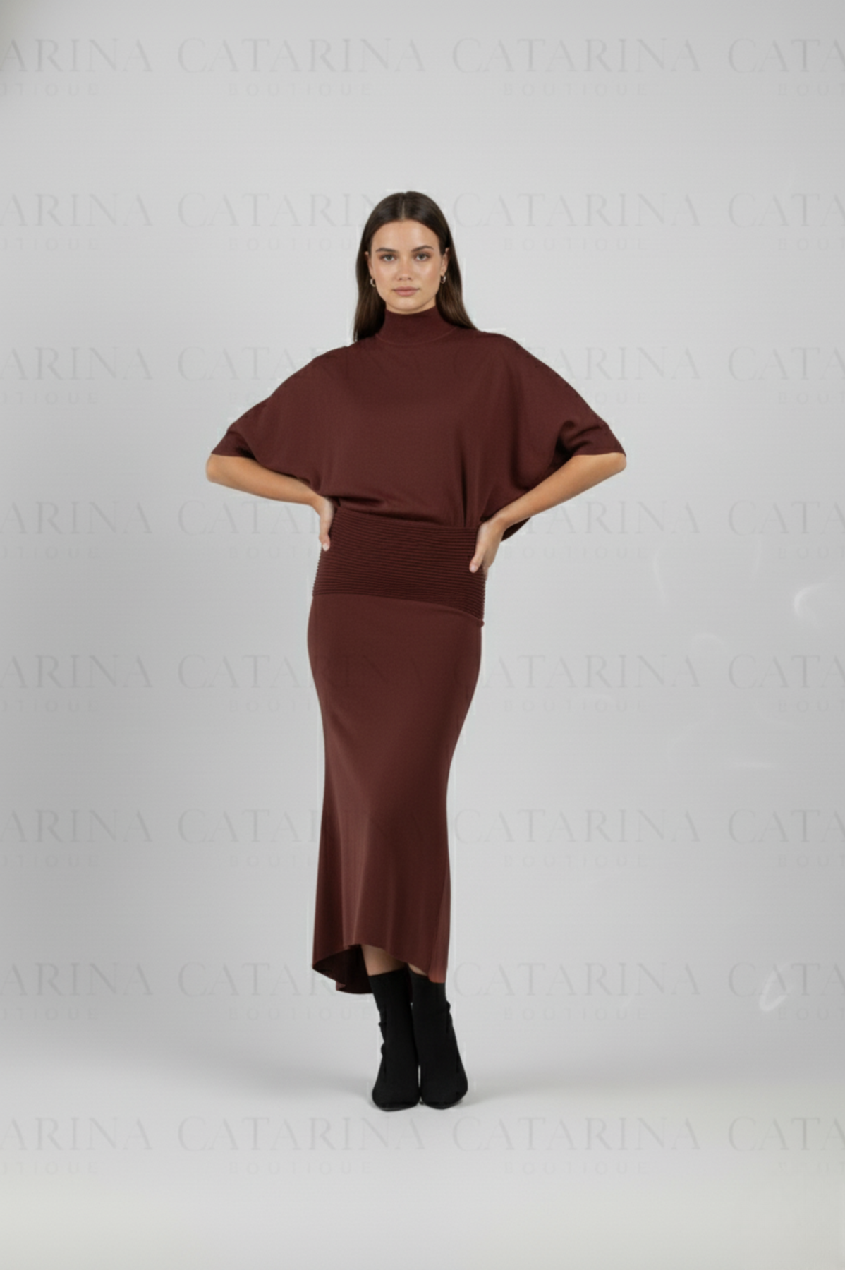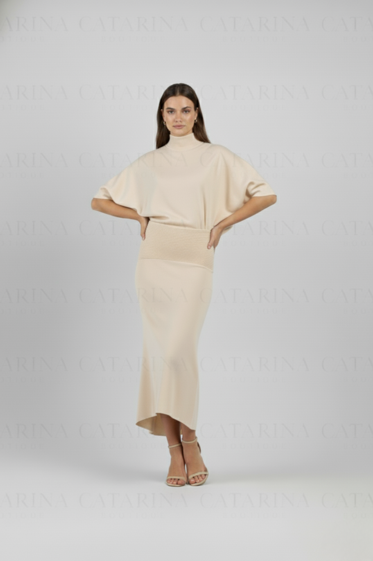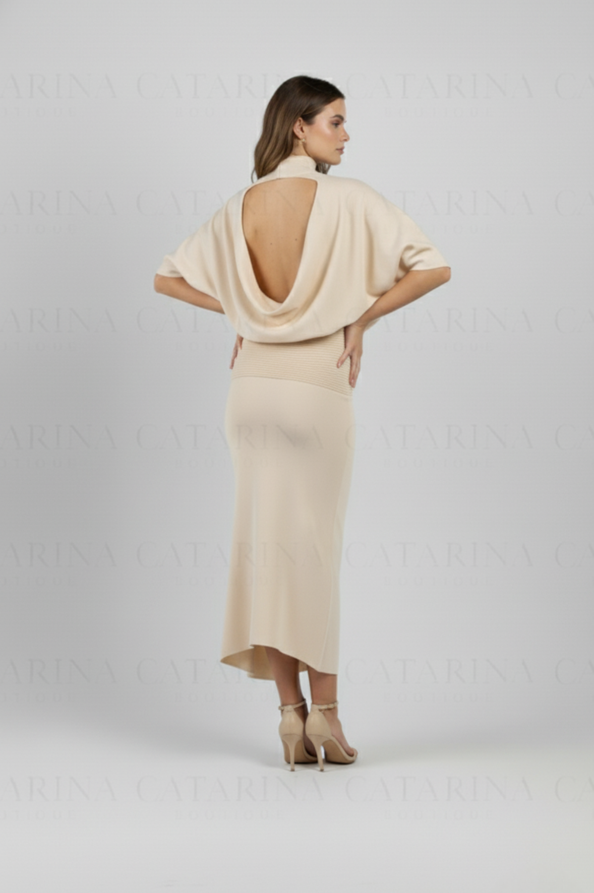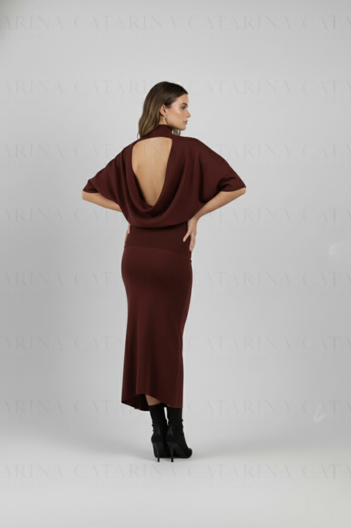 Vestido de color liso. Cuello tortuga. Bajo acabado recto. Escote pronunciado en espalda.