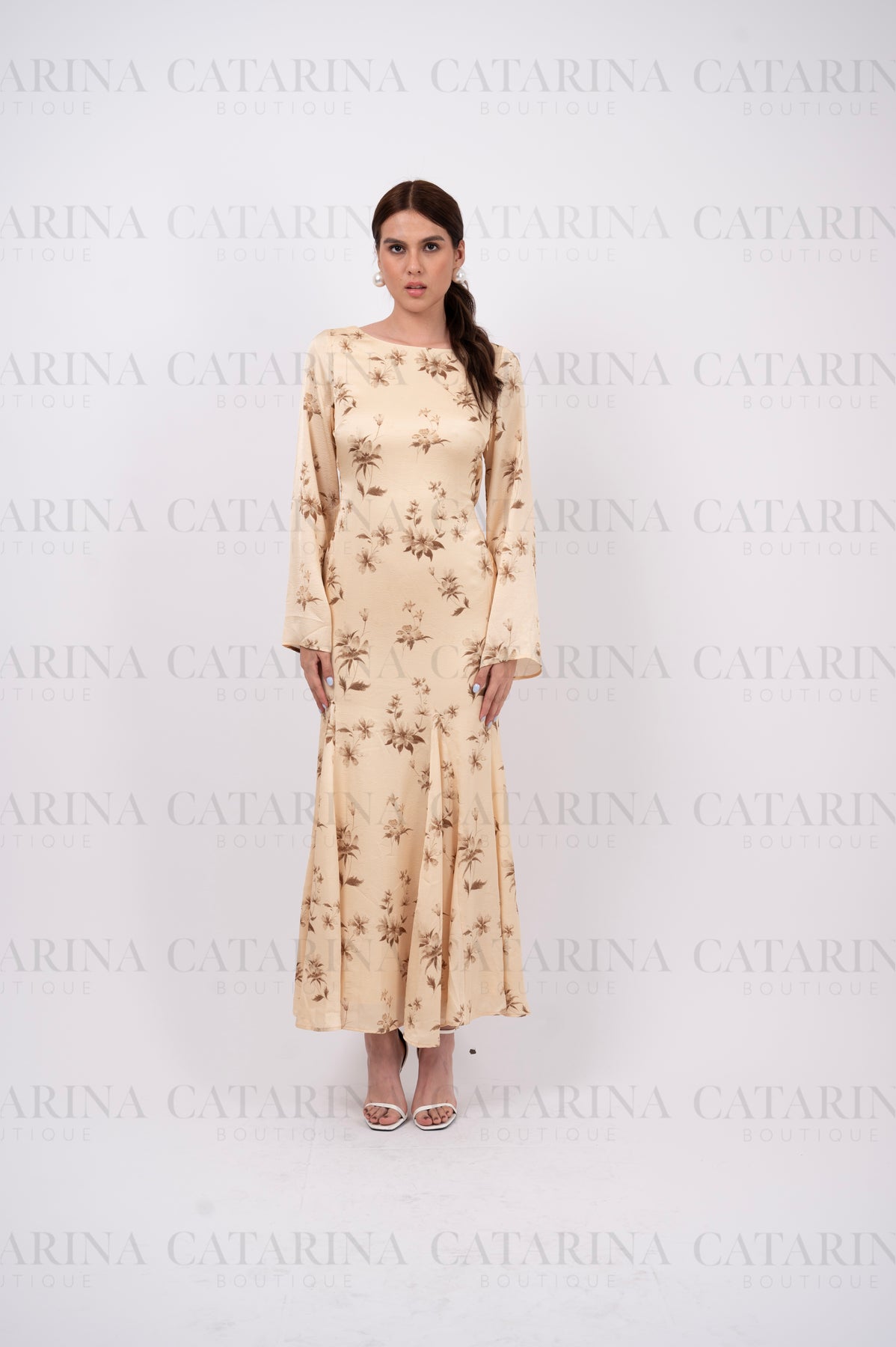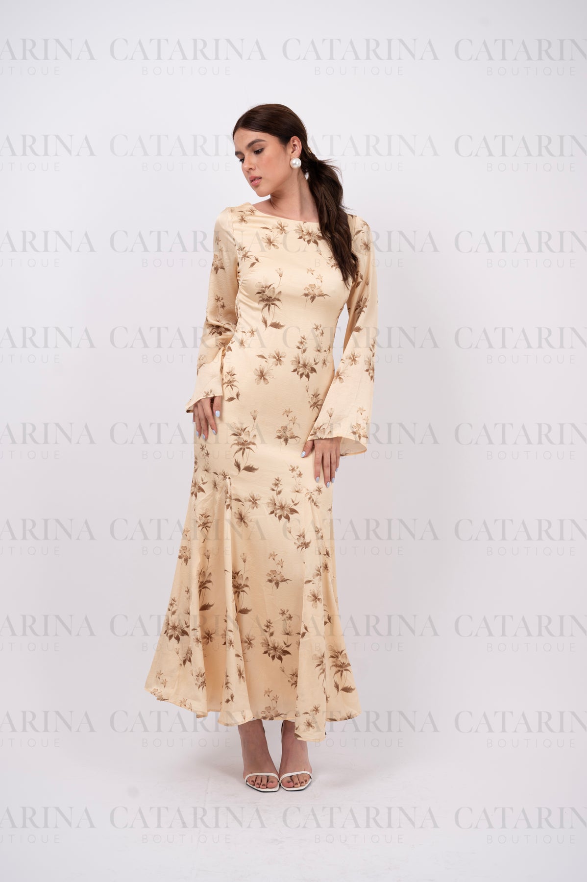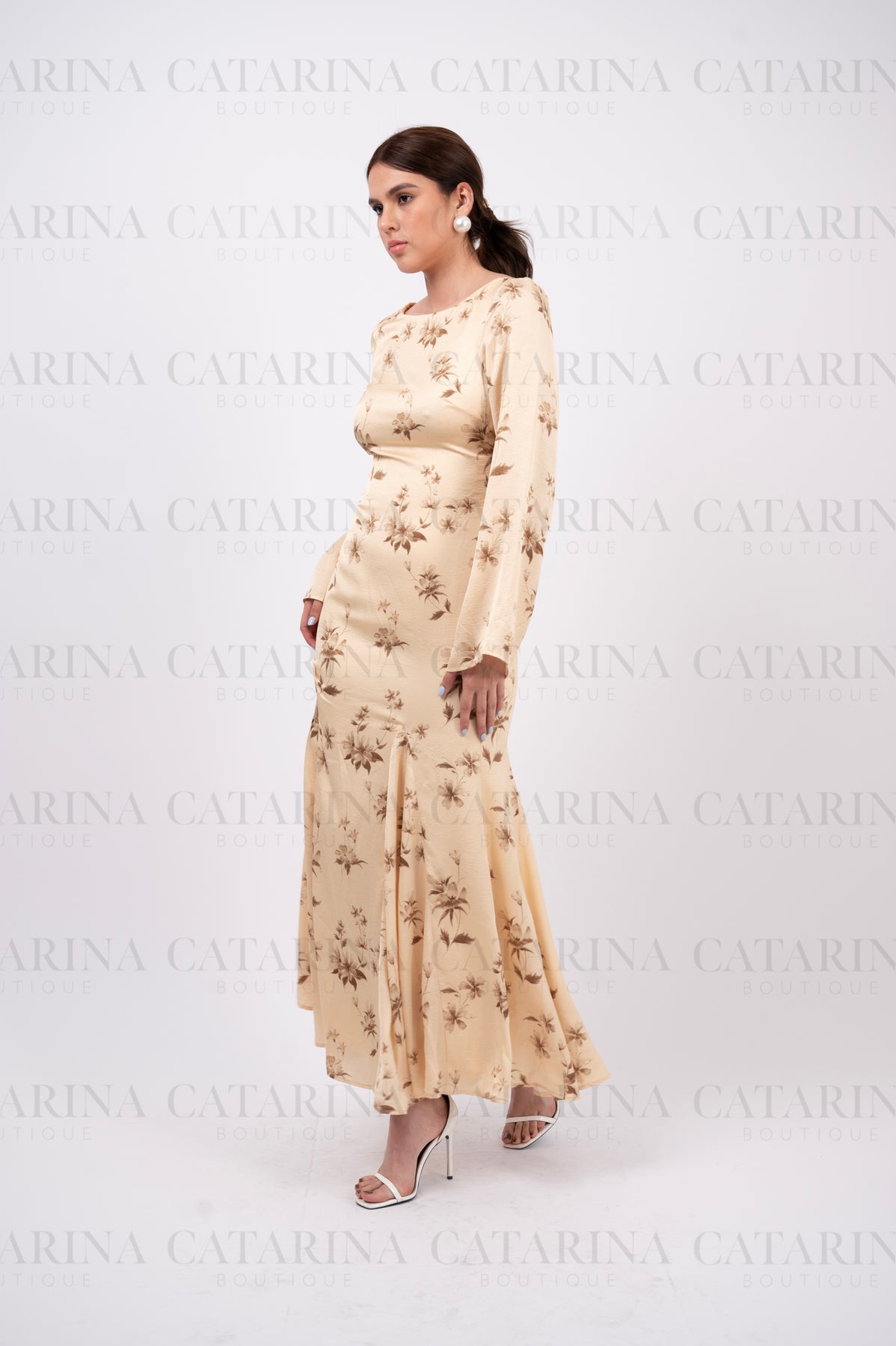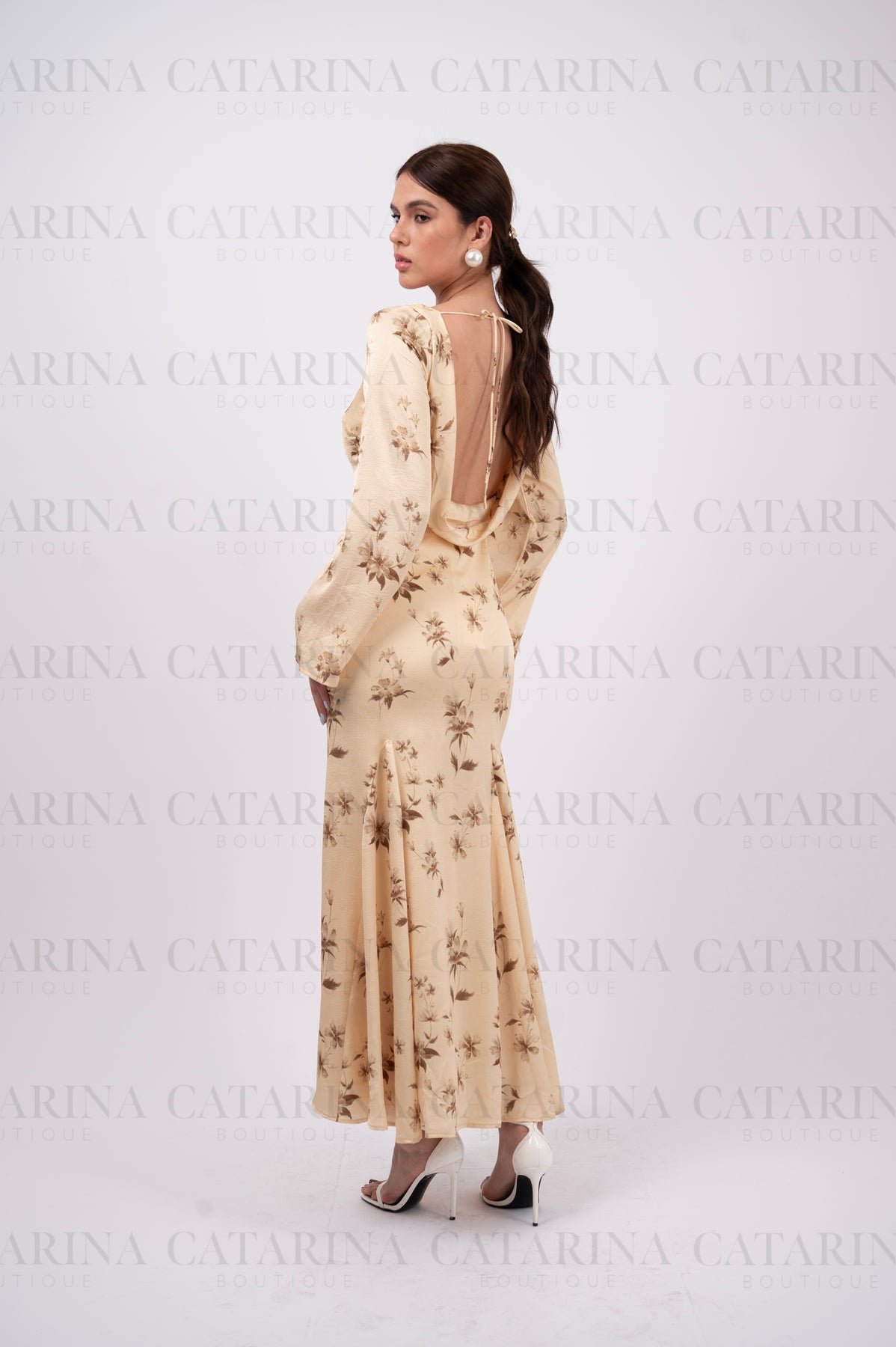 Vestido largo. Cuello redondo. Mangas largas. Escote en espalda. Bajo acabado recto.