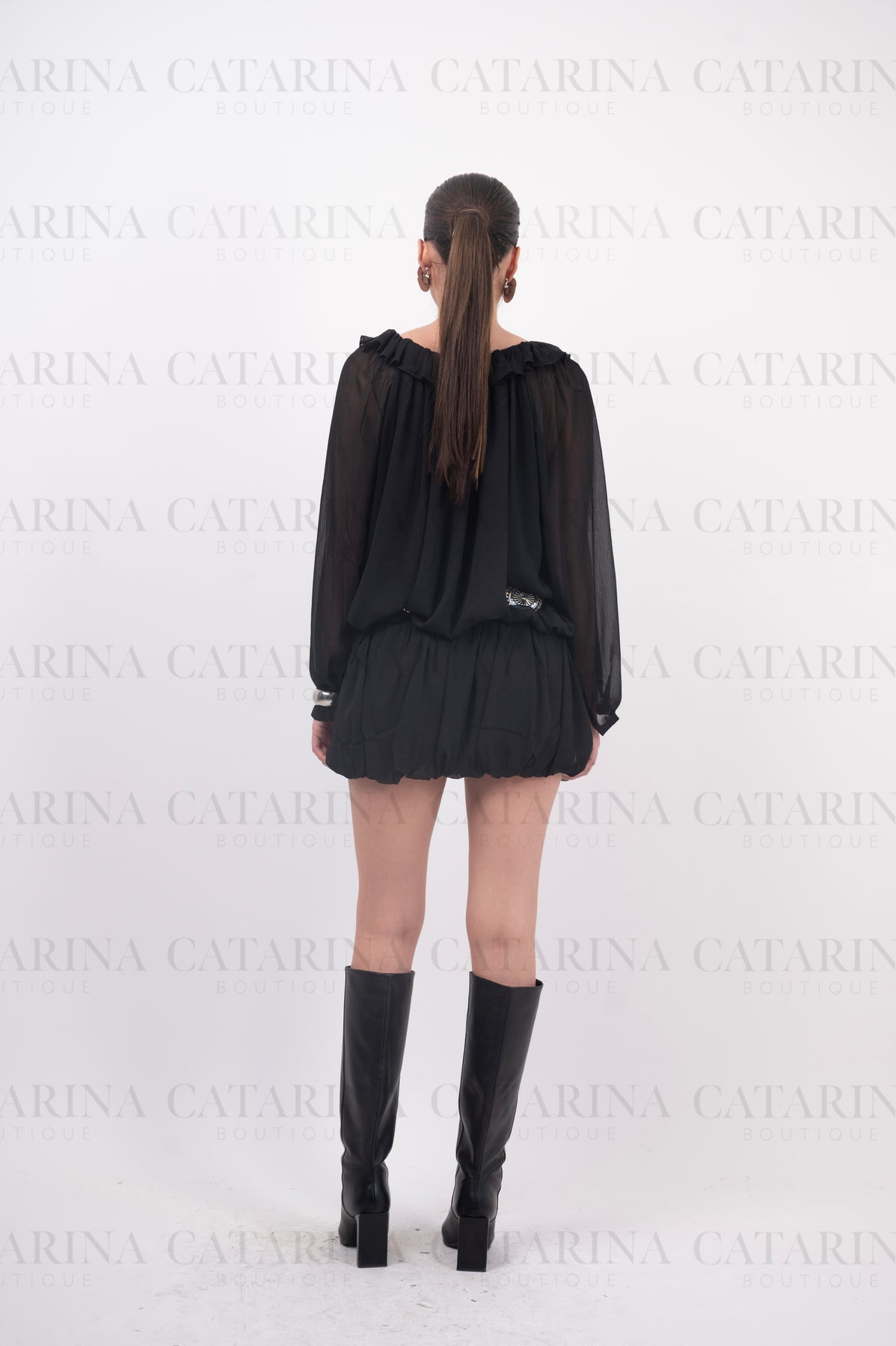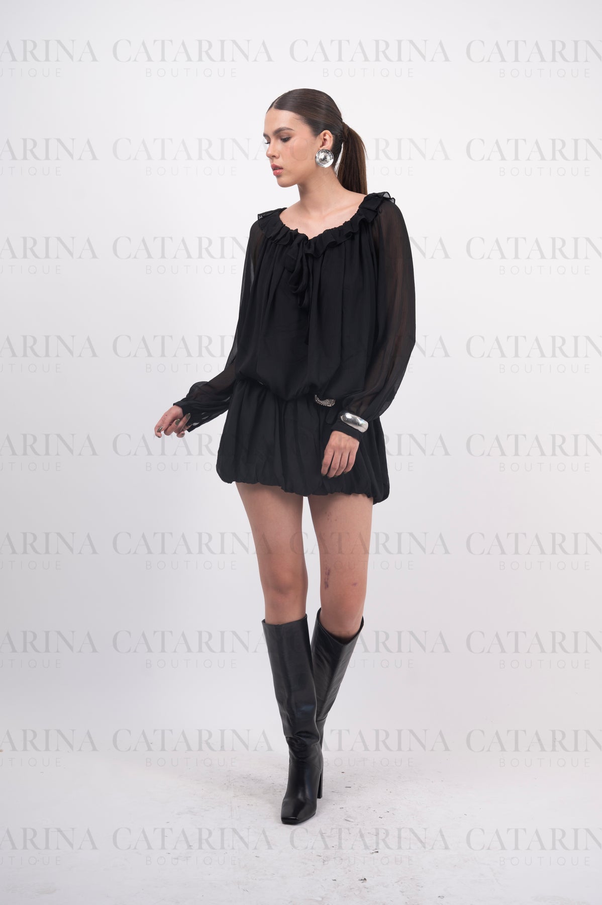 Vestido manga larga. Cuello V. Bajo acabado recto. Detalle de olanes al frente.