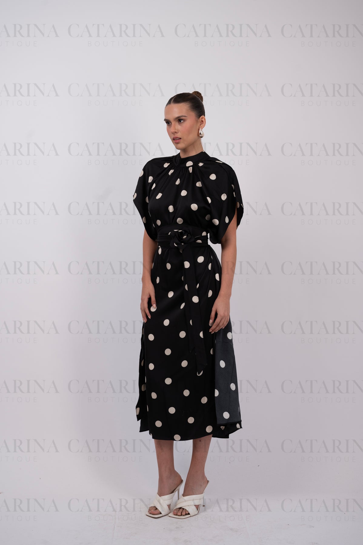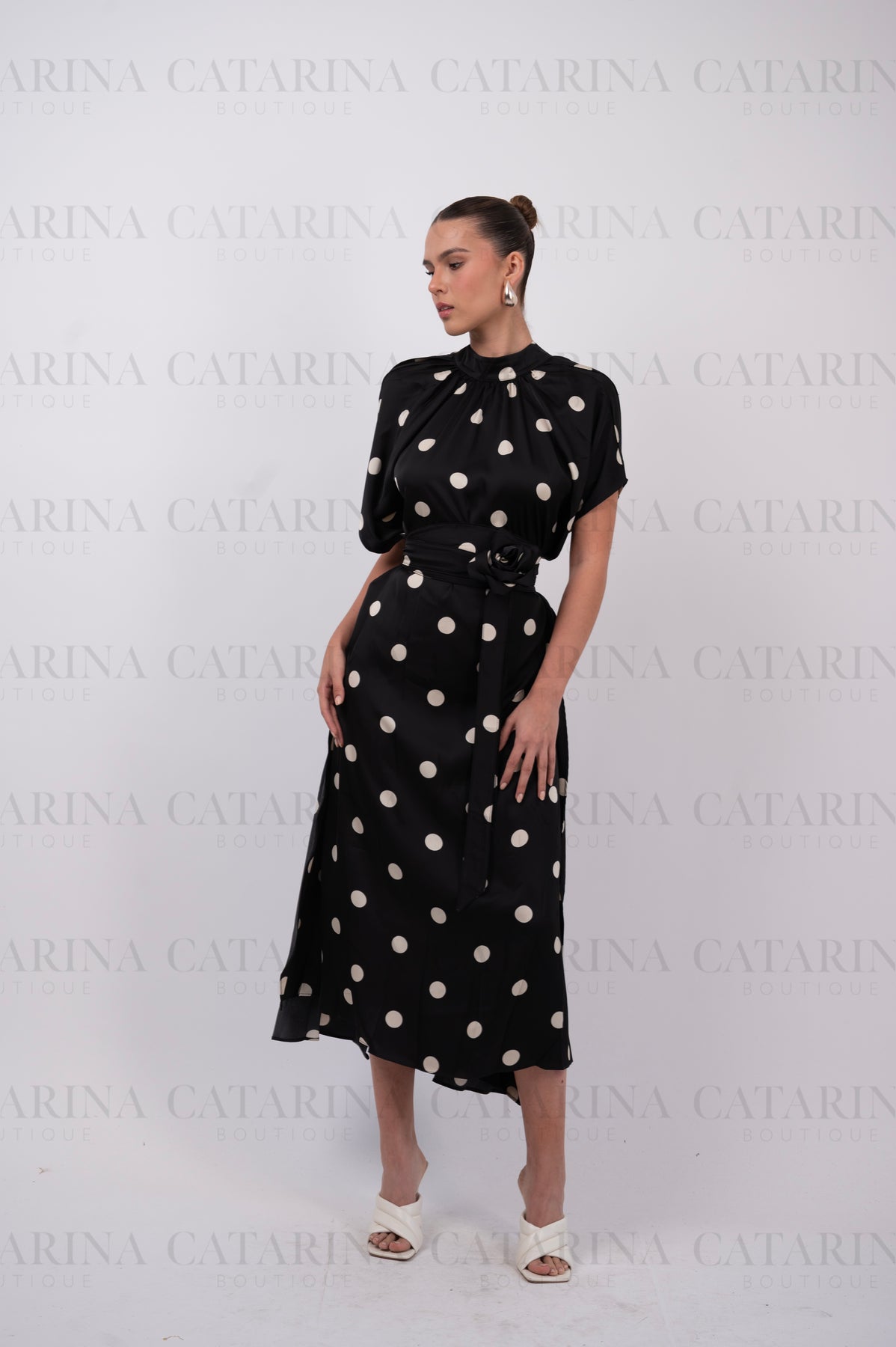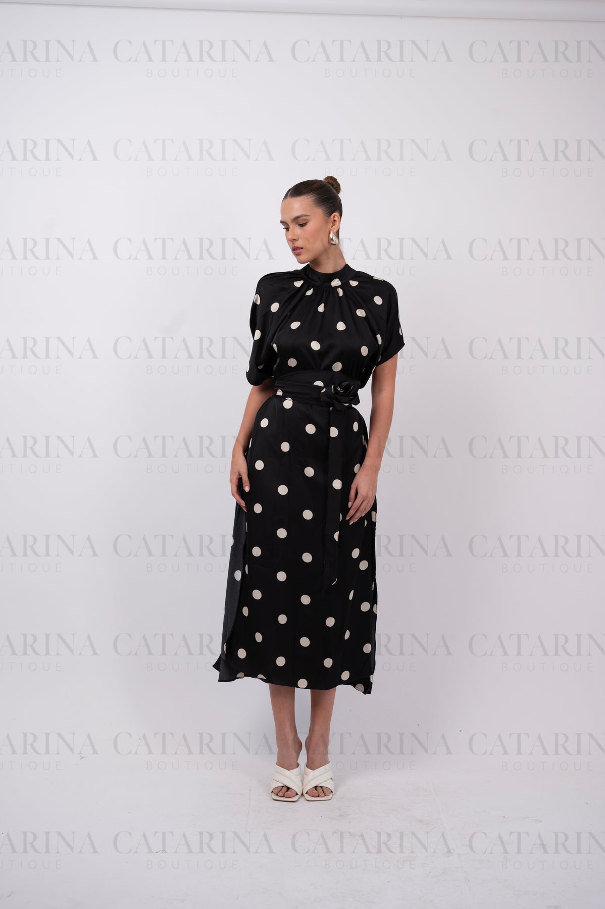 Vestido largo femenino en color negro con estampado clásico de lunares que aporta un estilo elegante y atemporal. Su diseño tipo halter y el lazo en la cintura estiliza la silueta y añade un toque sofisticado. La tela ligera y fluida crea una caída suave que brinda movimiento, convirtiéndolo en una opción ideal para eventos, cenas o looks elegantes de verano.