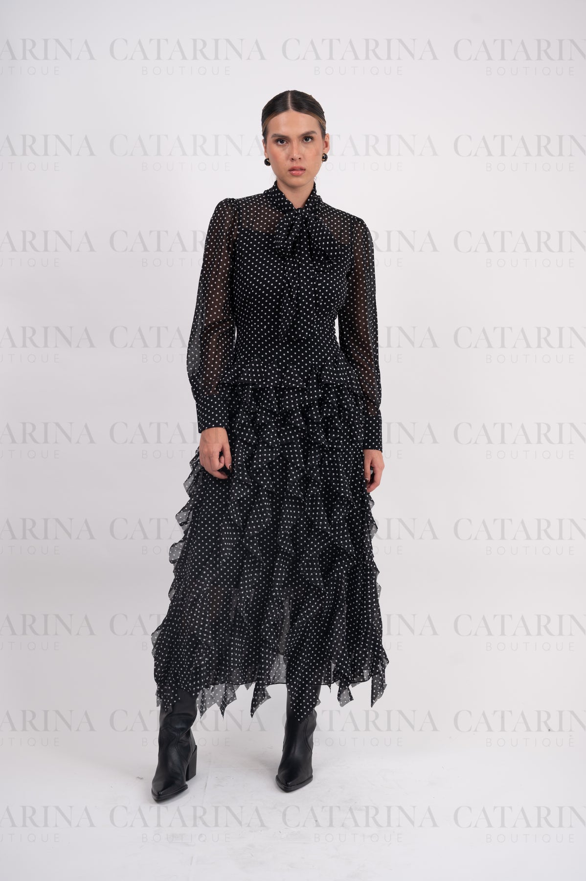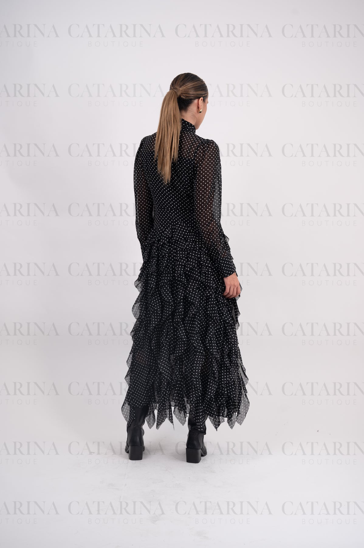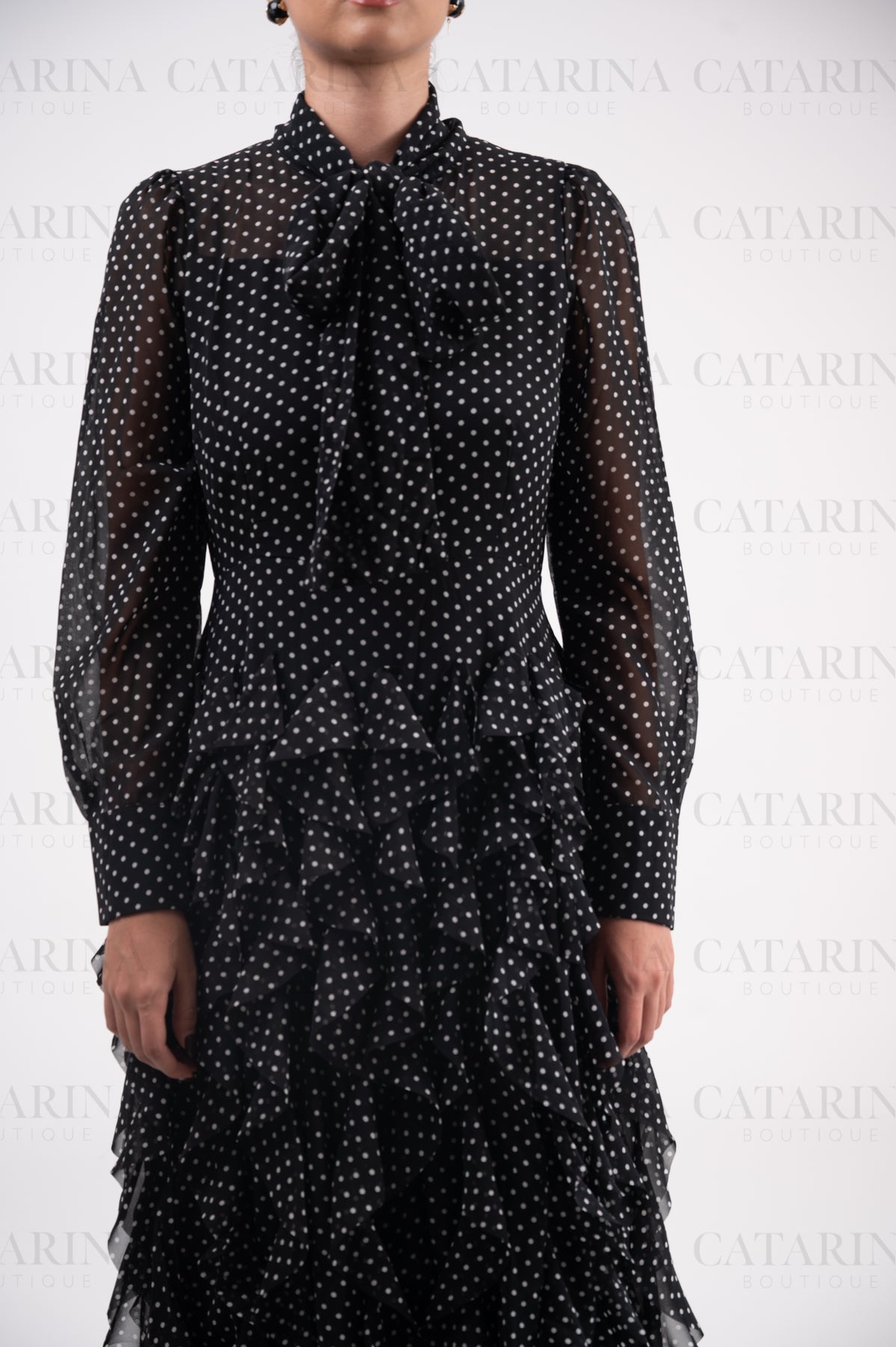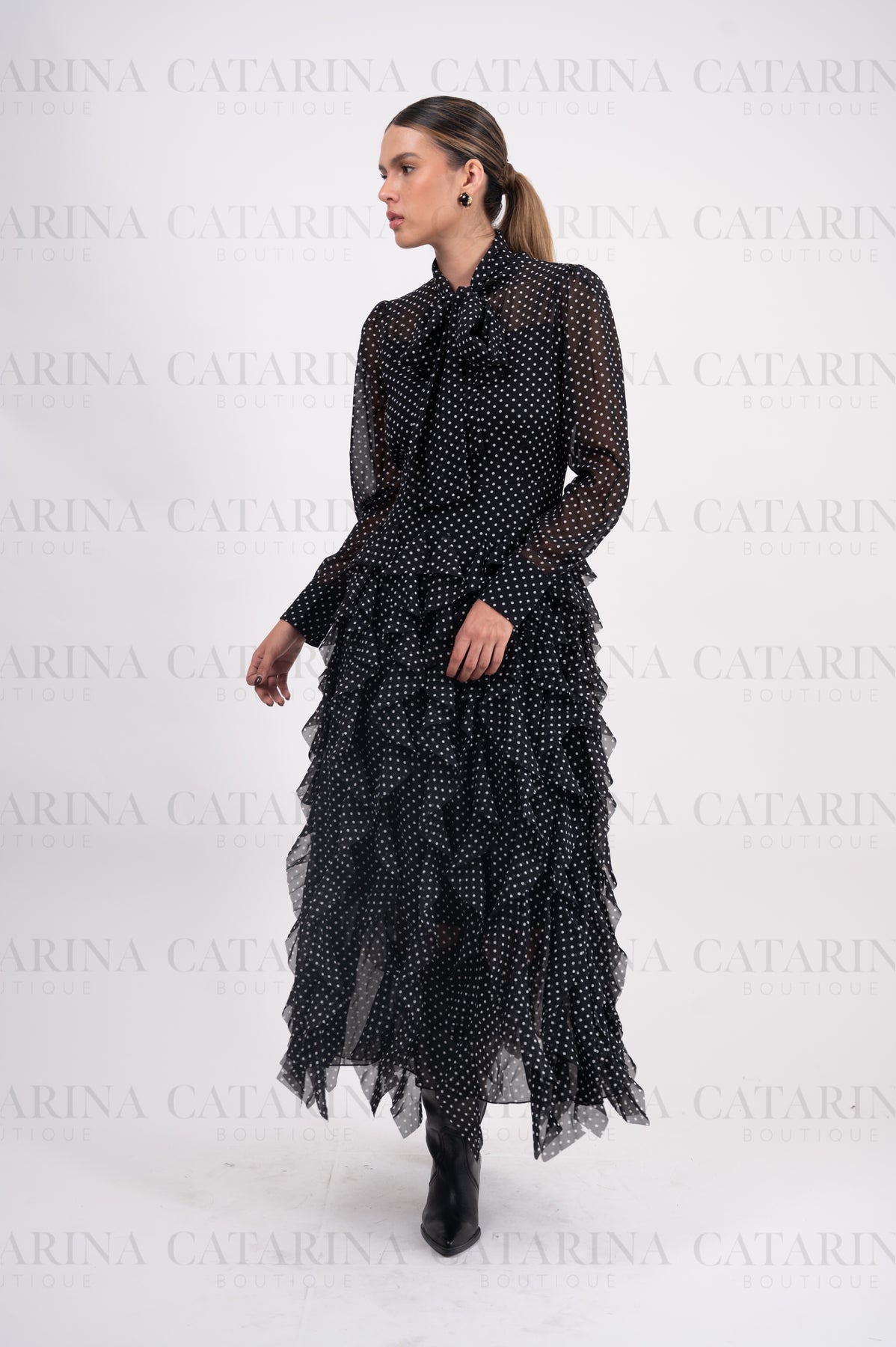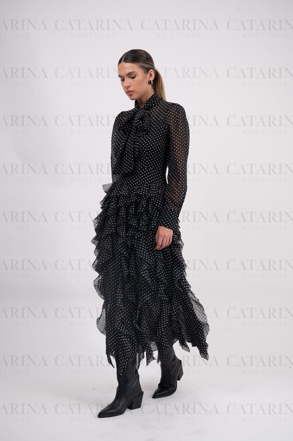 Vestido de estampado boleado. Escote redondo con lazadas. Manga larga. Bajo acabado recto adornado con olanes.