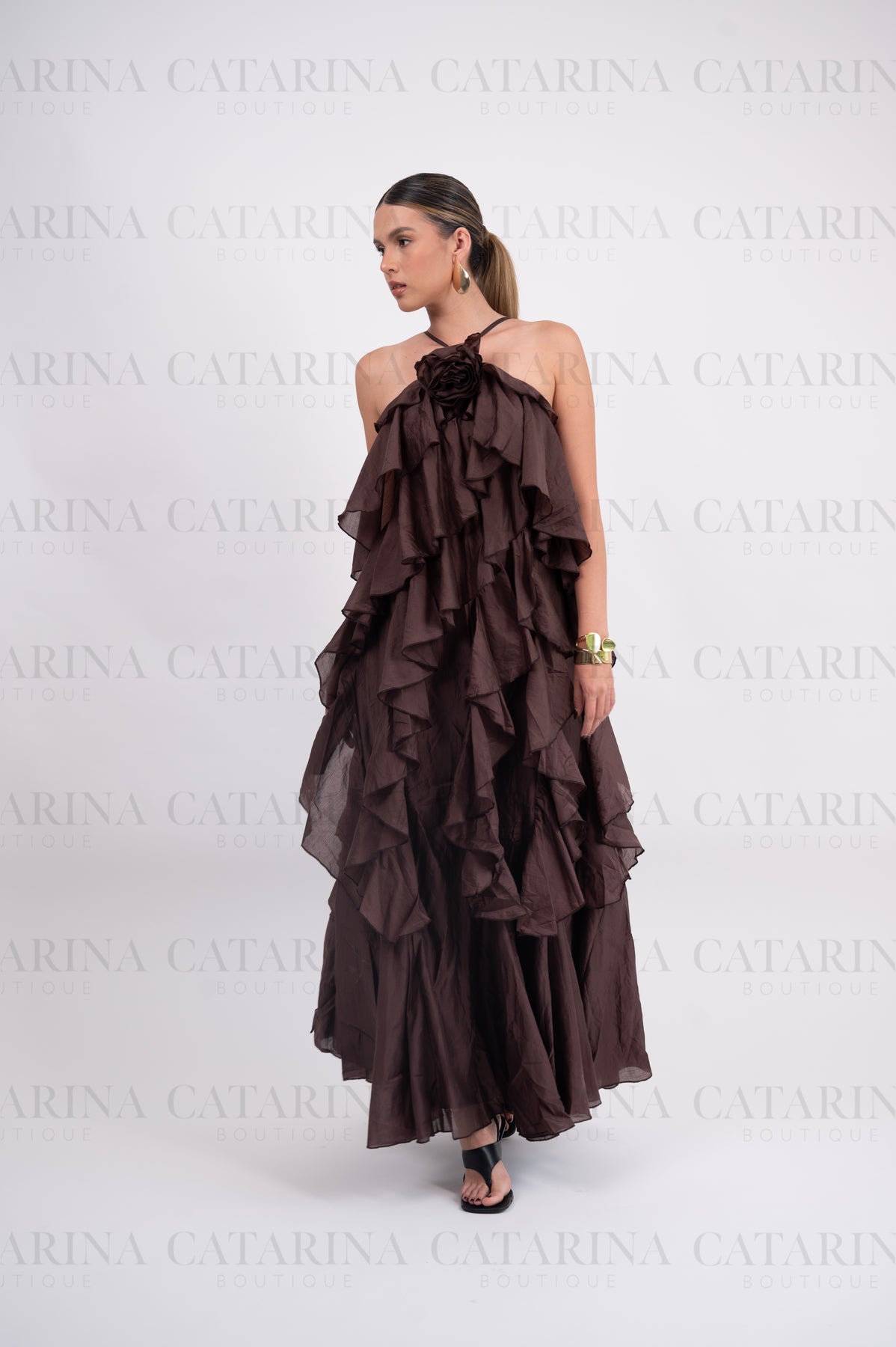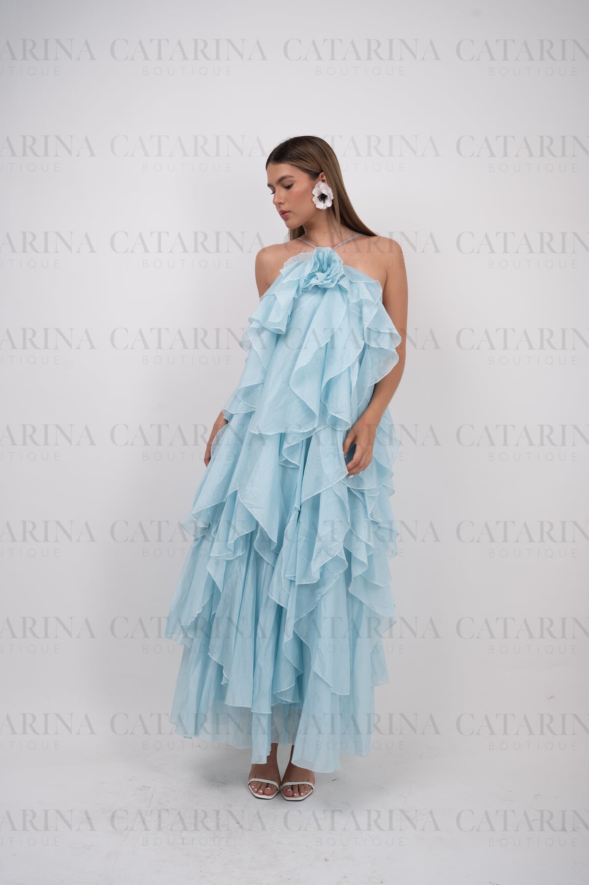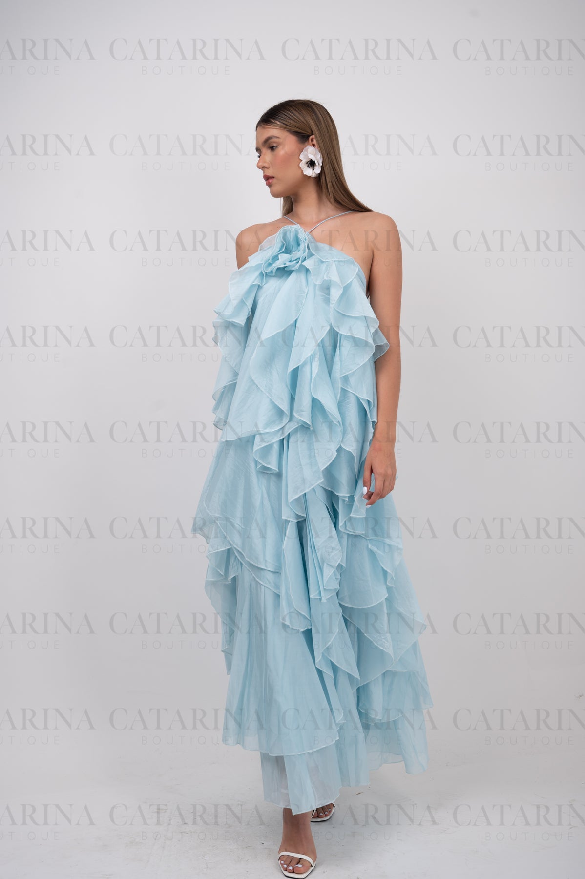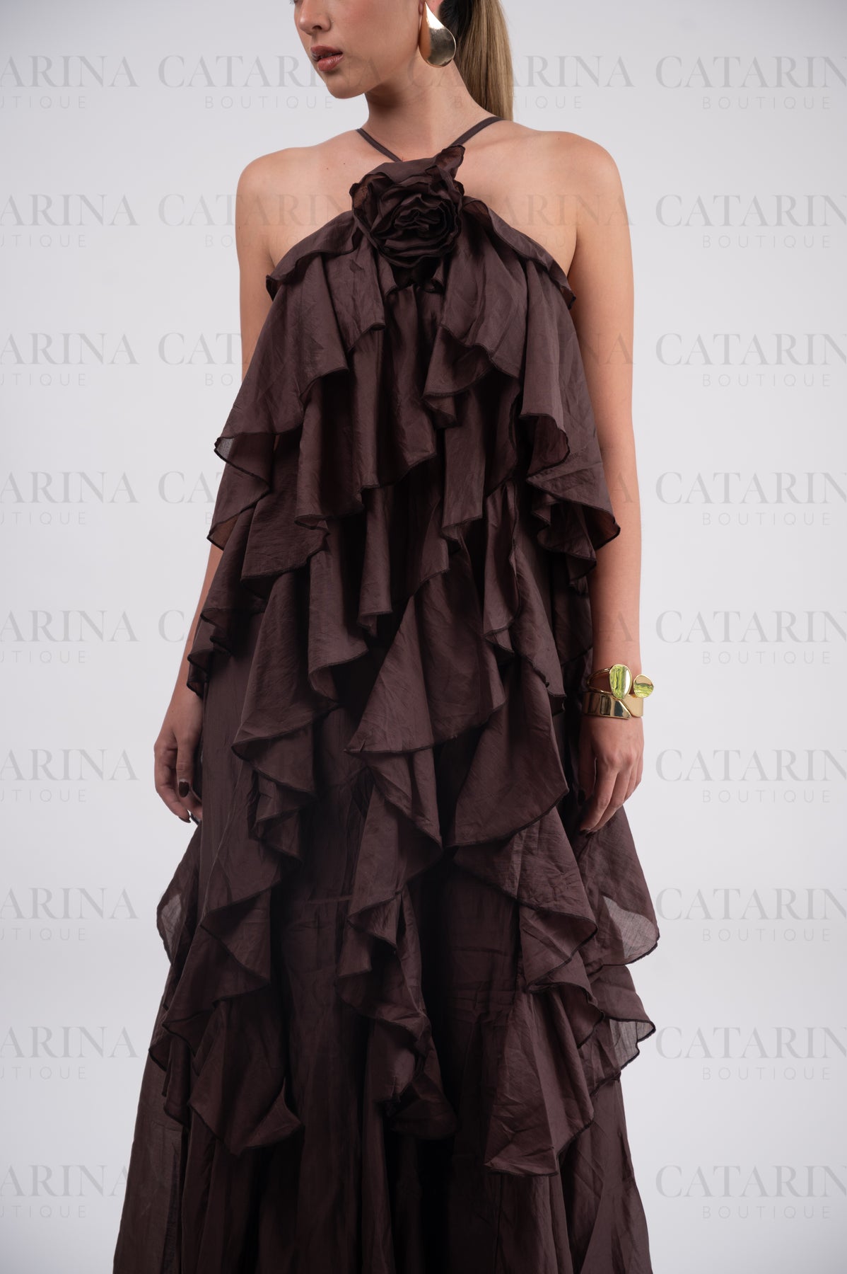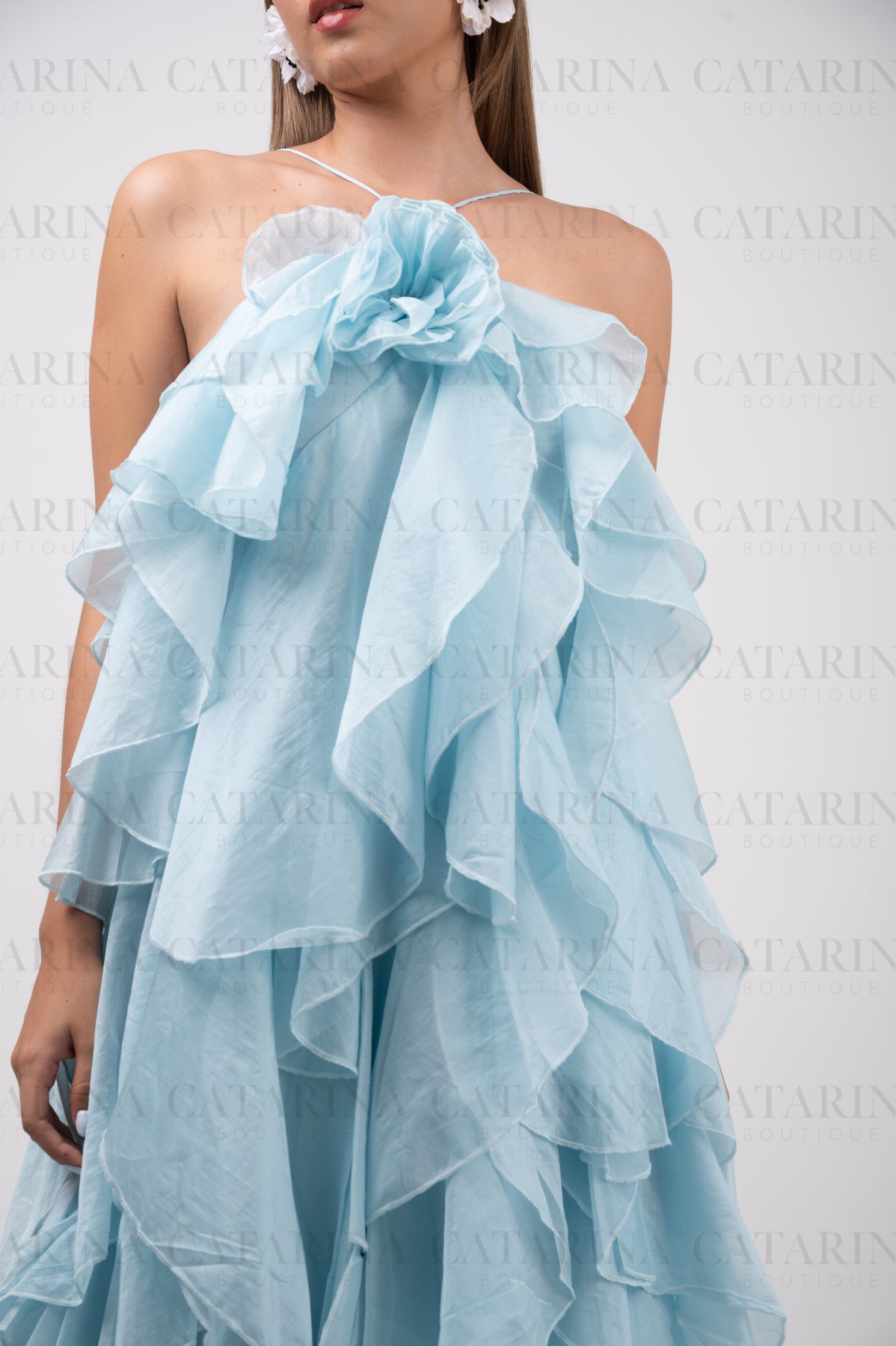 Vestido de color liso. Volantes en todo el cuerpo del vestido. Tipo halter. Detalle de flor al frente.