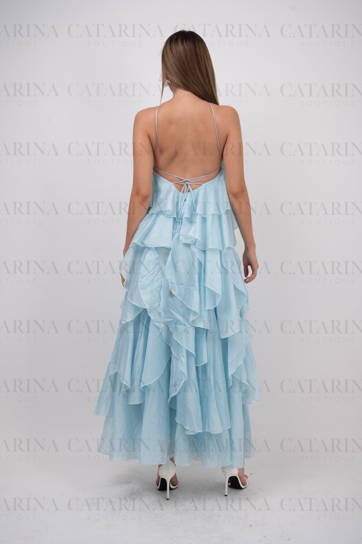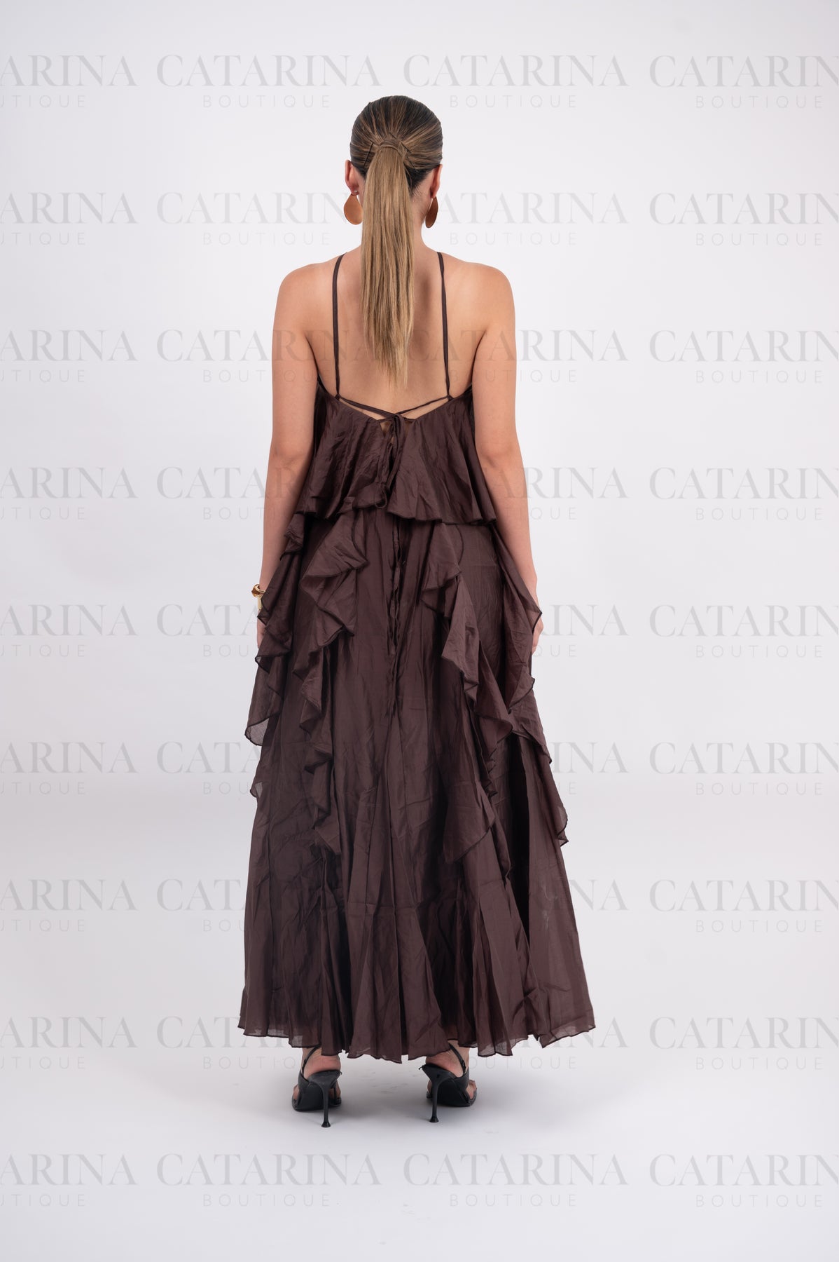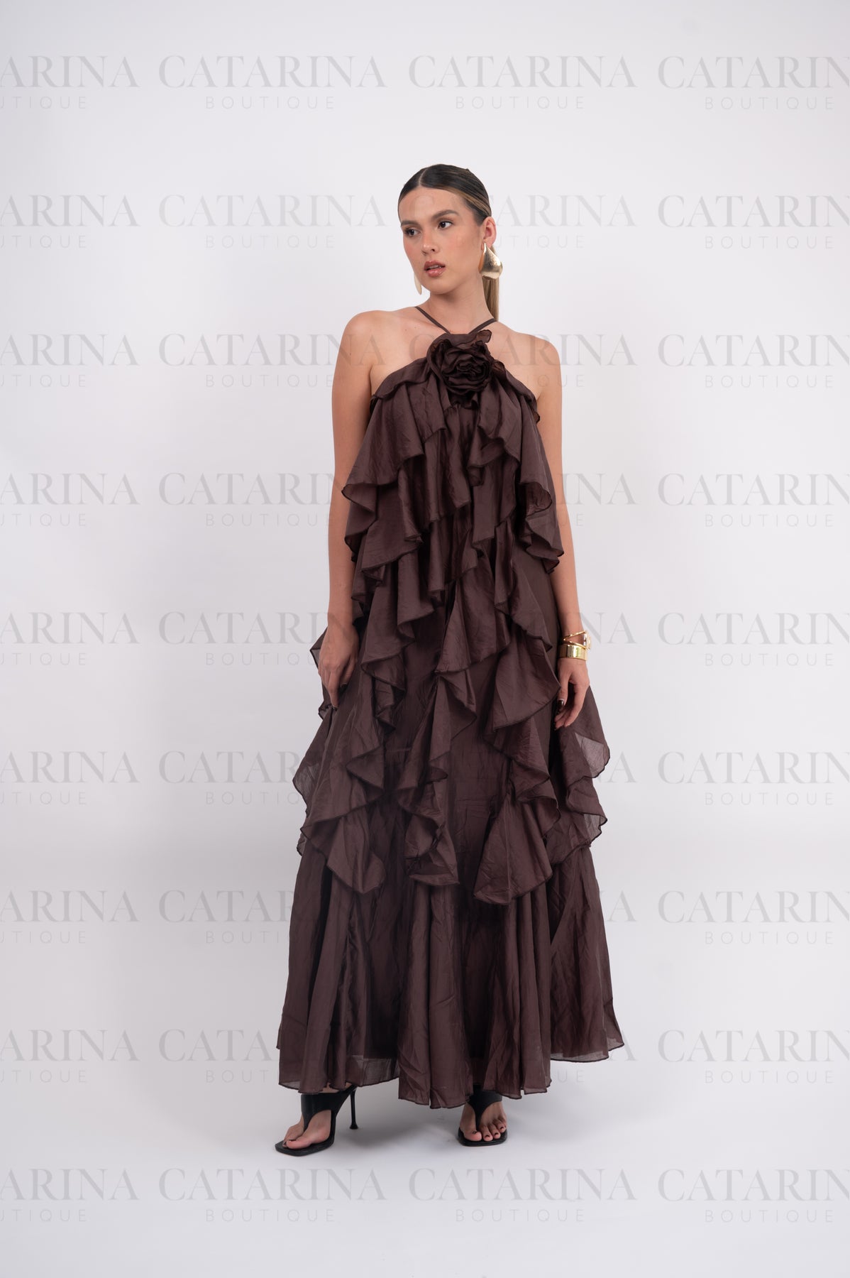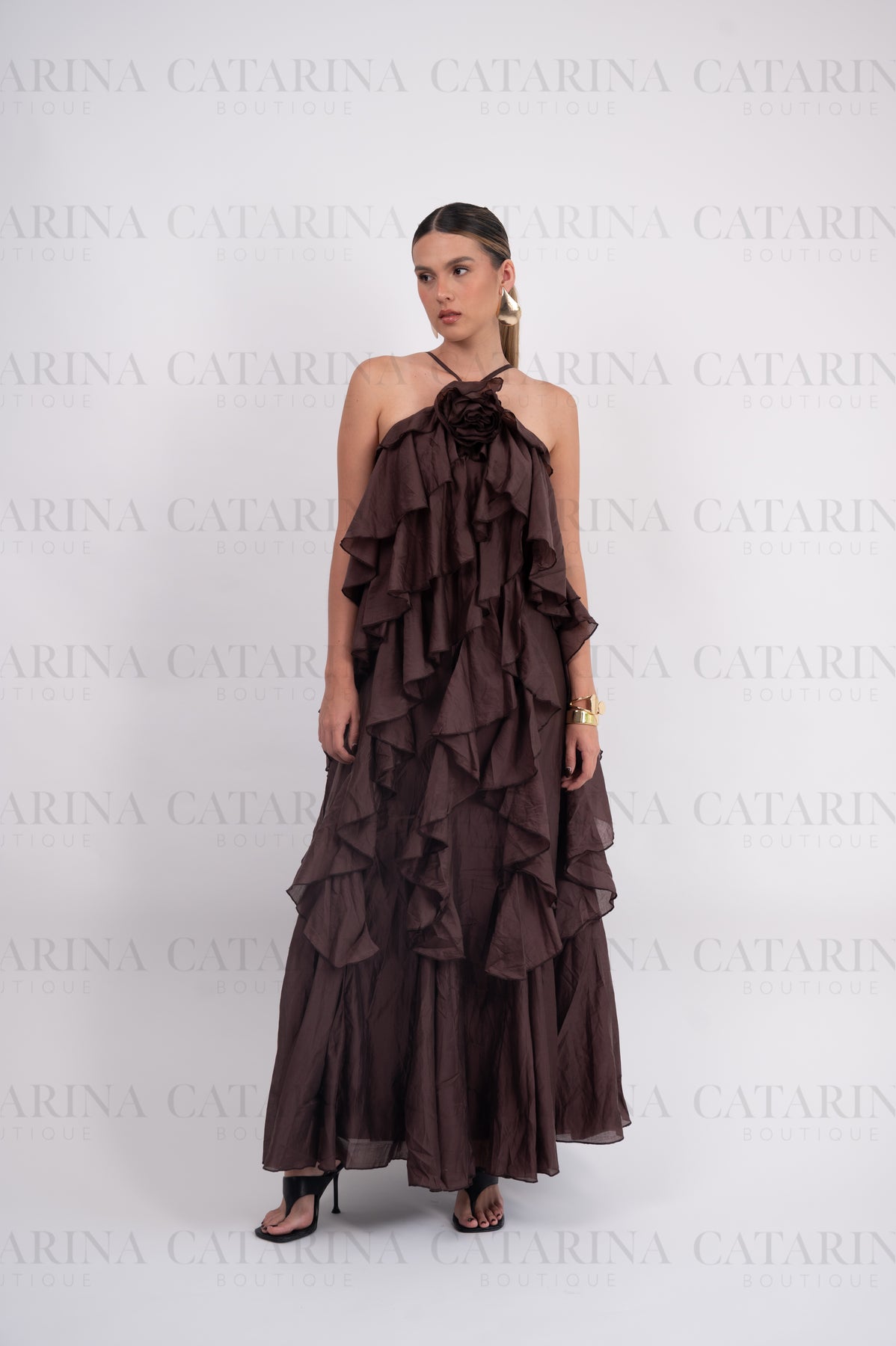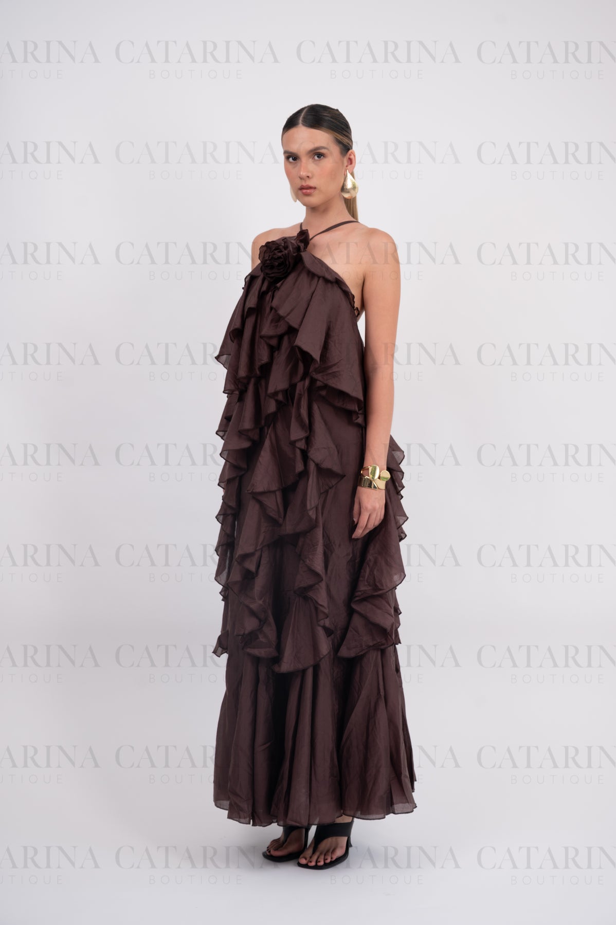Vestido de color liso. Volantes en todo el cuerpo del vestido. Tipo halter. Detalle de flor al frente.