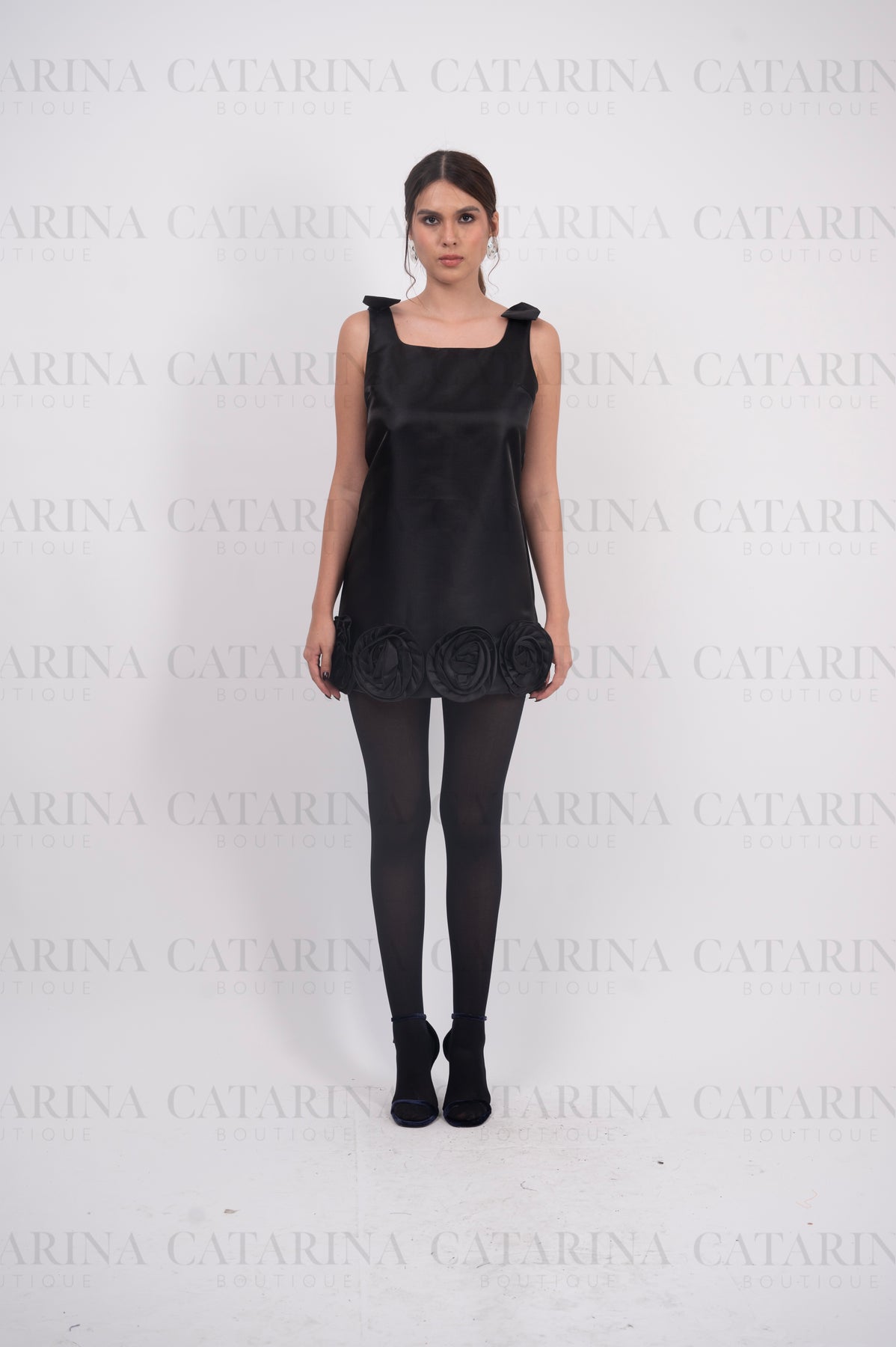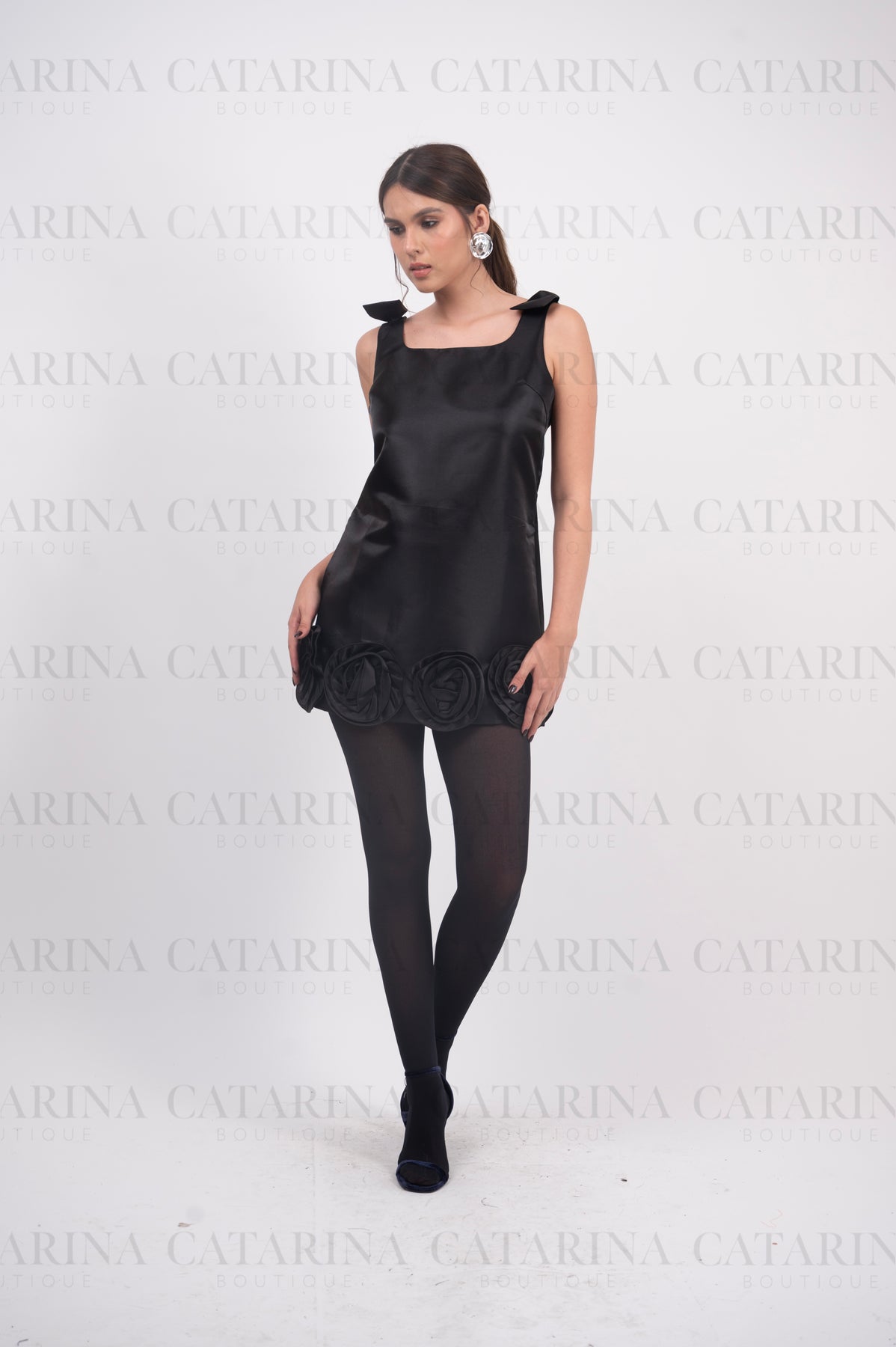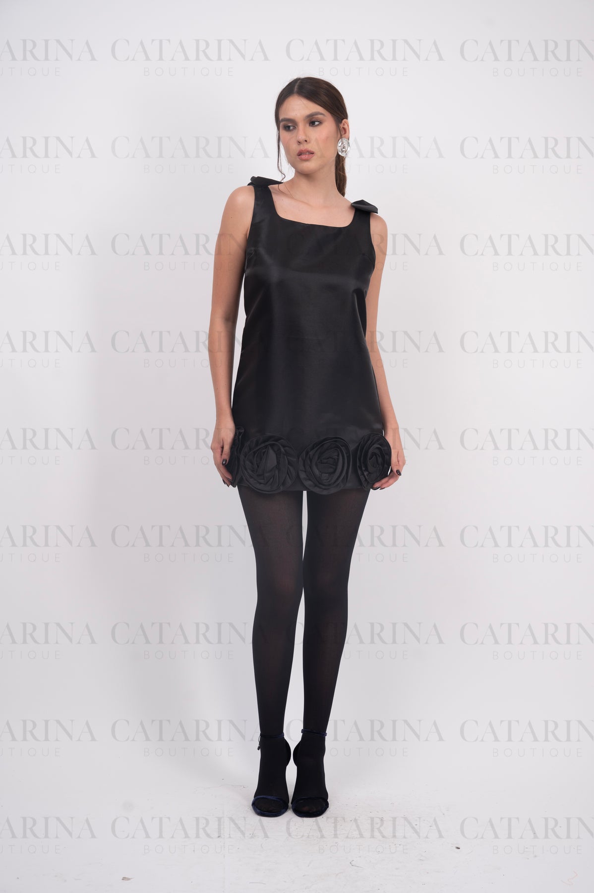 Vestido de color liso. Escote recto. Cierre oculto. Bajo acabado con detalle de rosas resaltadas.
