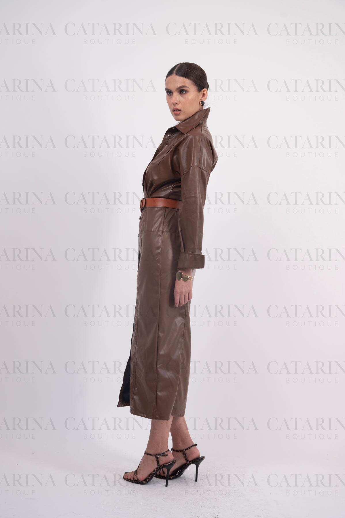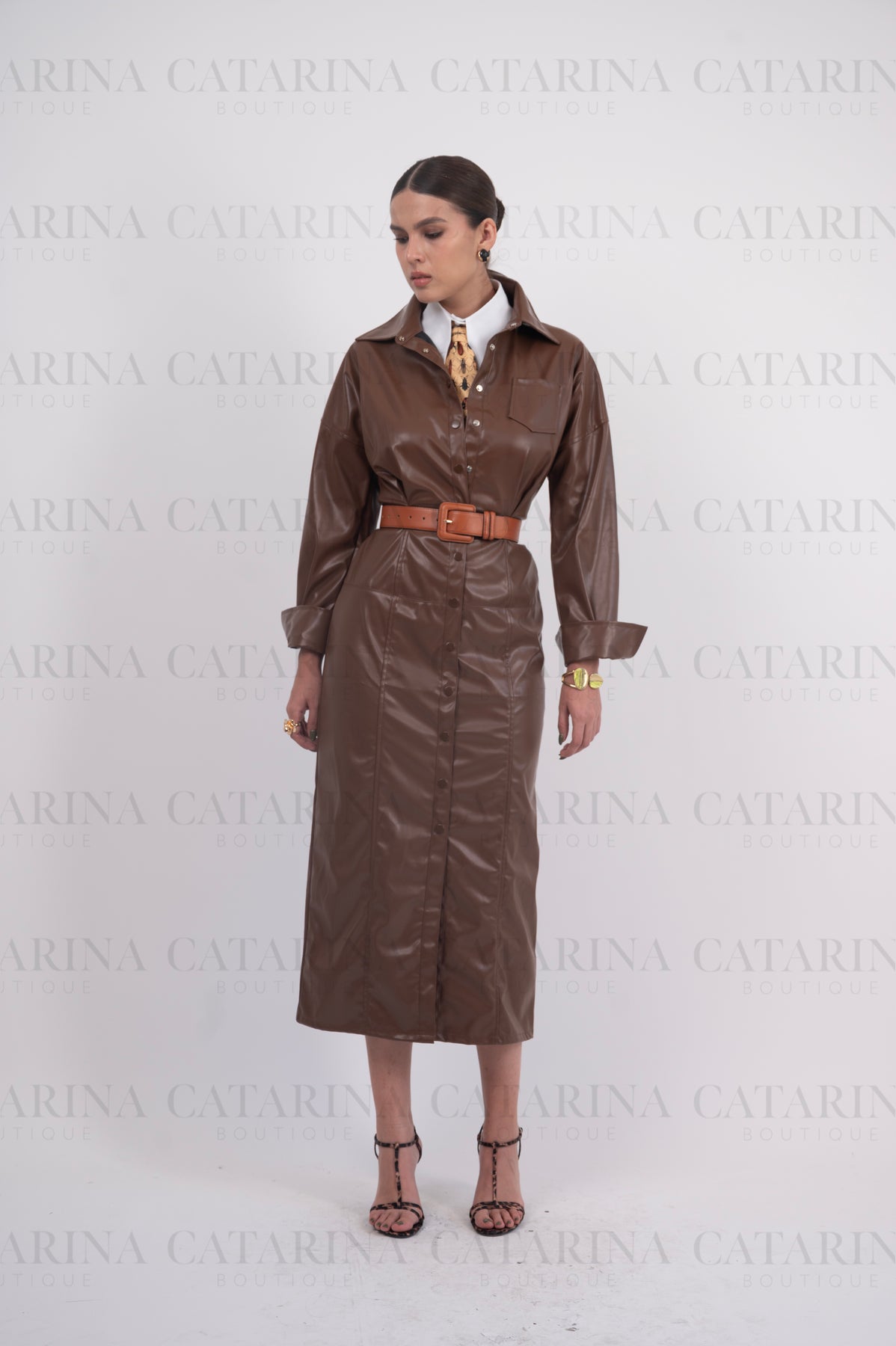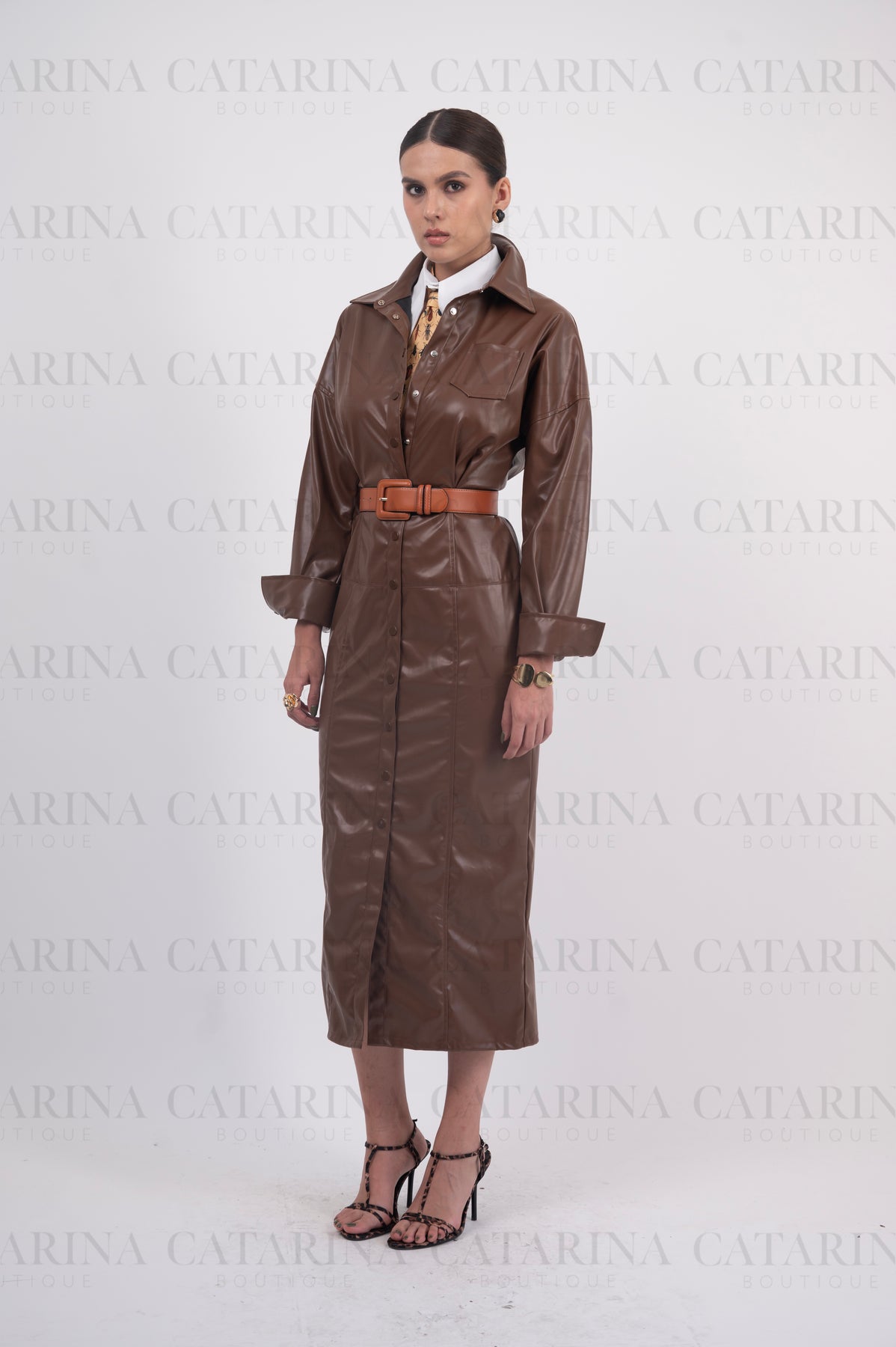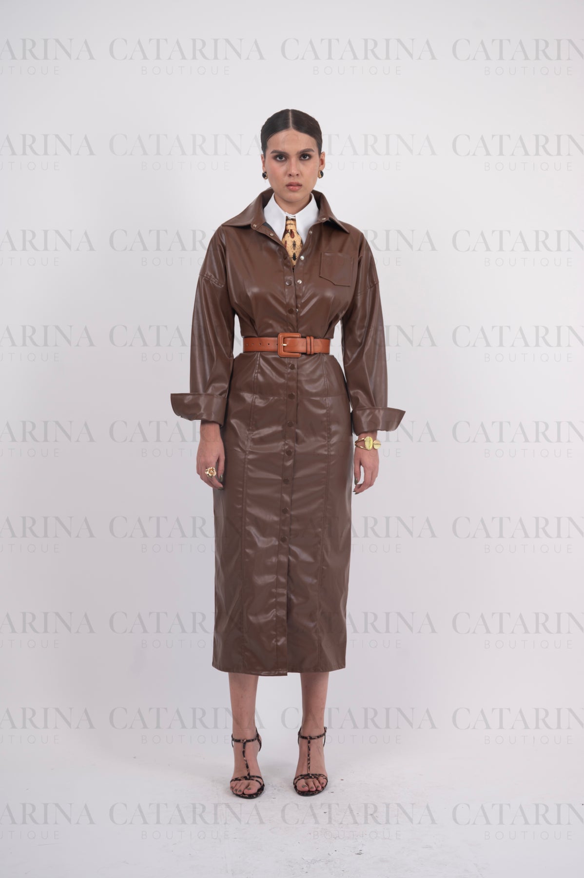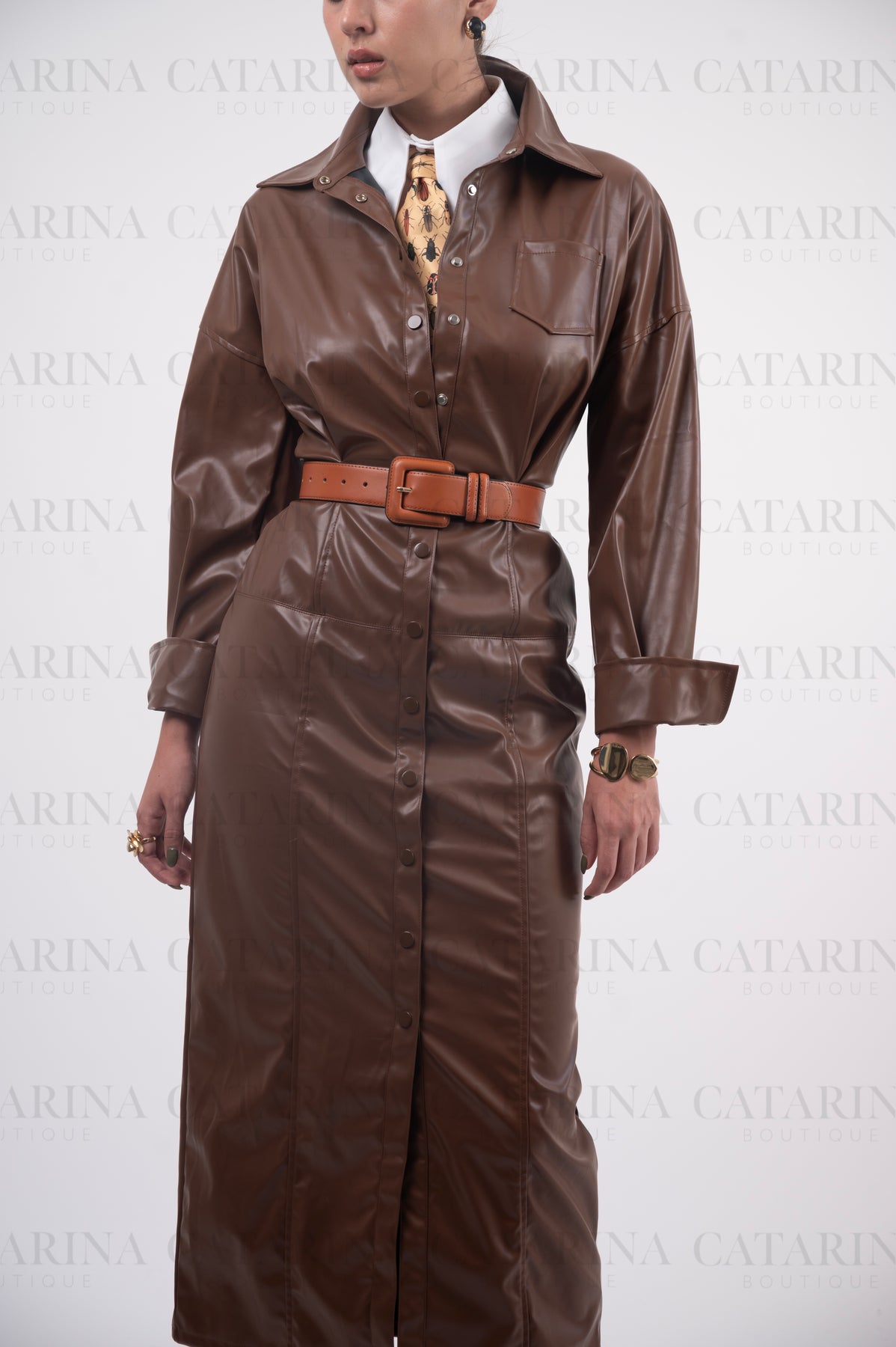 Vestido de cuello y solapa con manga larga.  Vinipiel en todo el cuerpo del vestido. Bajo acabado recto.